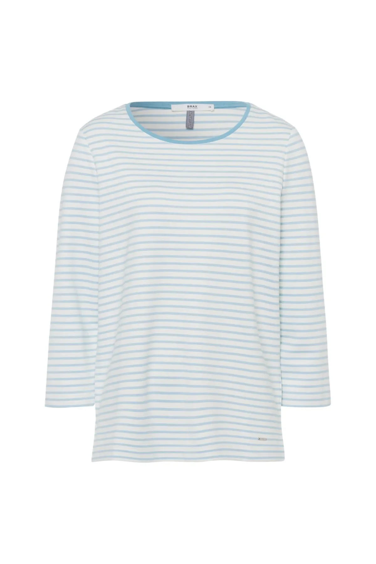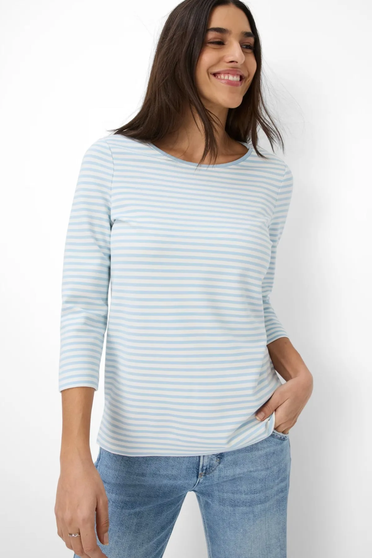 The Bonnie Tee features a round neckline and 3/4 sleeves with fine stripes for a fresh, sporty look. Made from soft, stretchy fabric, it offers comfort, durability, and easy care—ideal for everyday wear.