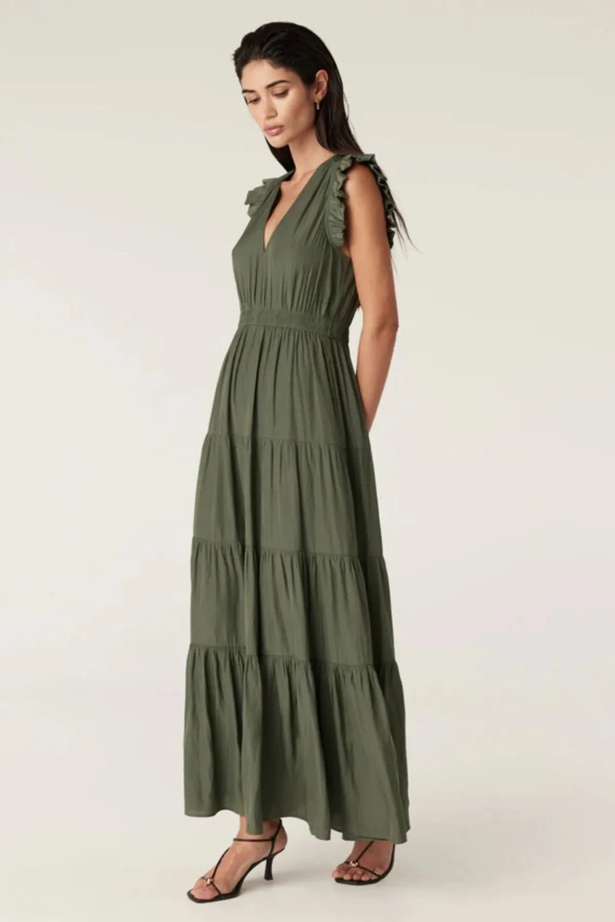 The Kahlo Maxi Dress offers a regular fit and maxi length, designed for elegance and comfort. It features a V-neck, a fully elasticated waist, side pockets, and a tiered skirt that enhances its flowing silhouette.