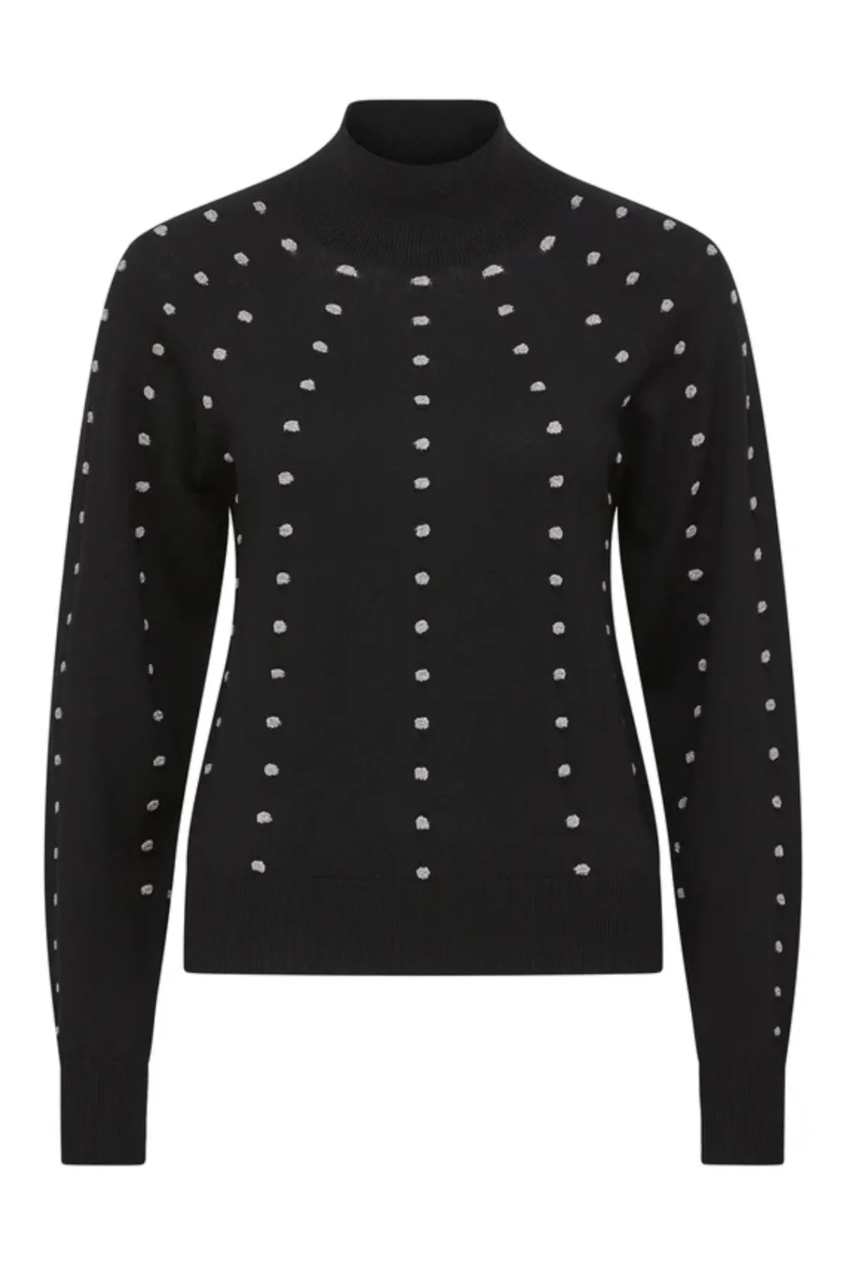 The Isla Merino Jumper is a lightweight knit designed with a regular fit. This seamless style features a contrast lurex bobble detail throughout the body and sleeves. Finished with a ribbed turtle neck and raglan sleeves.