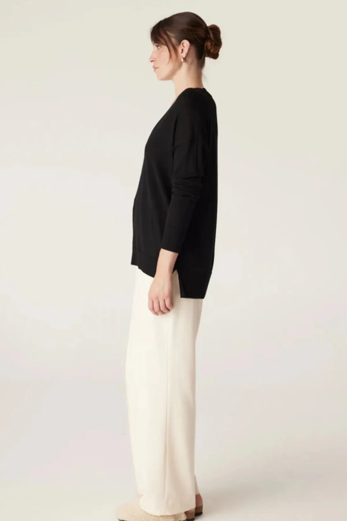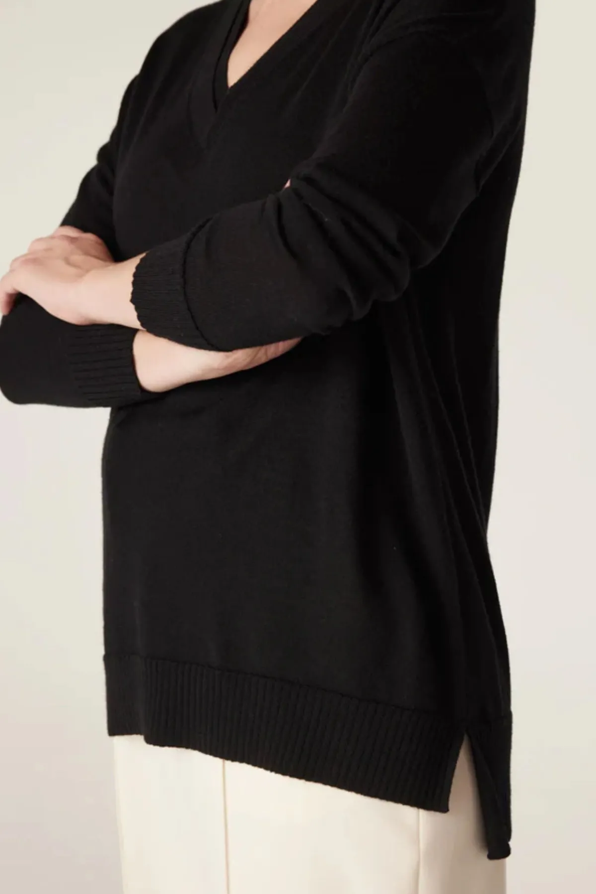 The Saxon Fine Merino Jumper is made from 100% Australian Woolmark Certified Merino Wool and offers a lightweight knit in a regular fit. Designed with a V-neckline and double collar trim detail, it features a high low hemline with side splits and a dropped shoulder for a relaxed look. Rib trims at the hem and cuffs provide a refined finish.