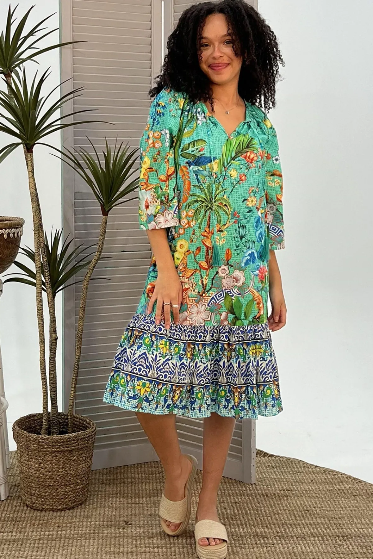 Introducing your new favourite dress! This midi length beauty has wide 3/4 sleeves, tassels at the neckline, and pockets on the side seams. The V-neckline adds a touch of elegance while the 100% cotton fabric offers comfort and breathability.