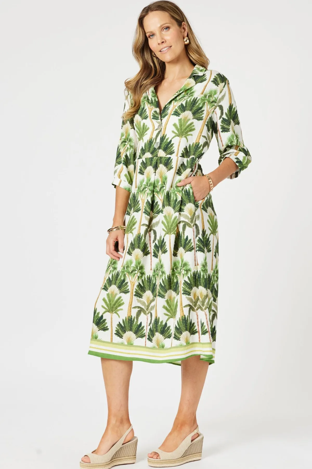 Step into tropical elegance with the Amazon Print Dress.Showcasing a lush green palm motif, this midi dress features a straight, easy-flowing skirt and a comfortable elasticated back waist for a flattering fit.