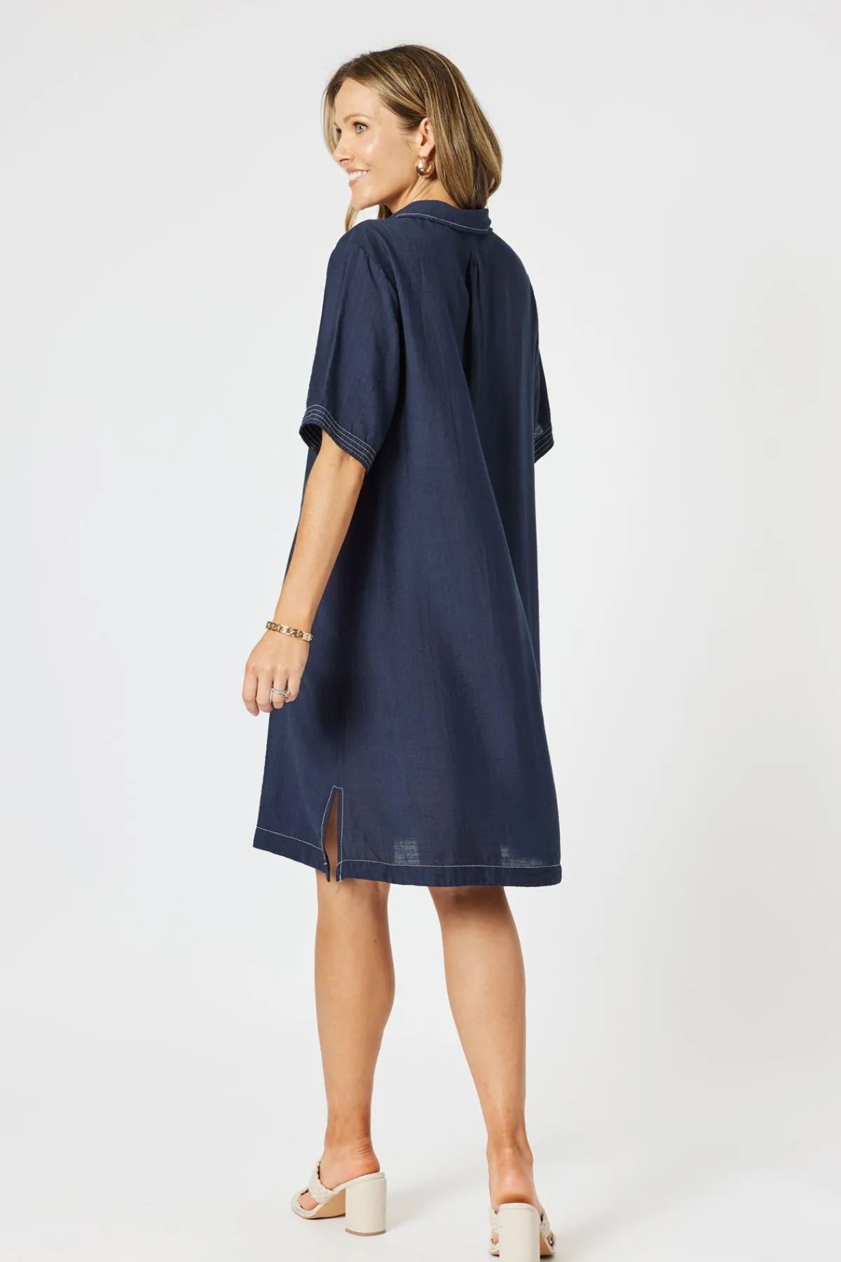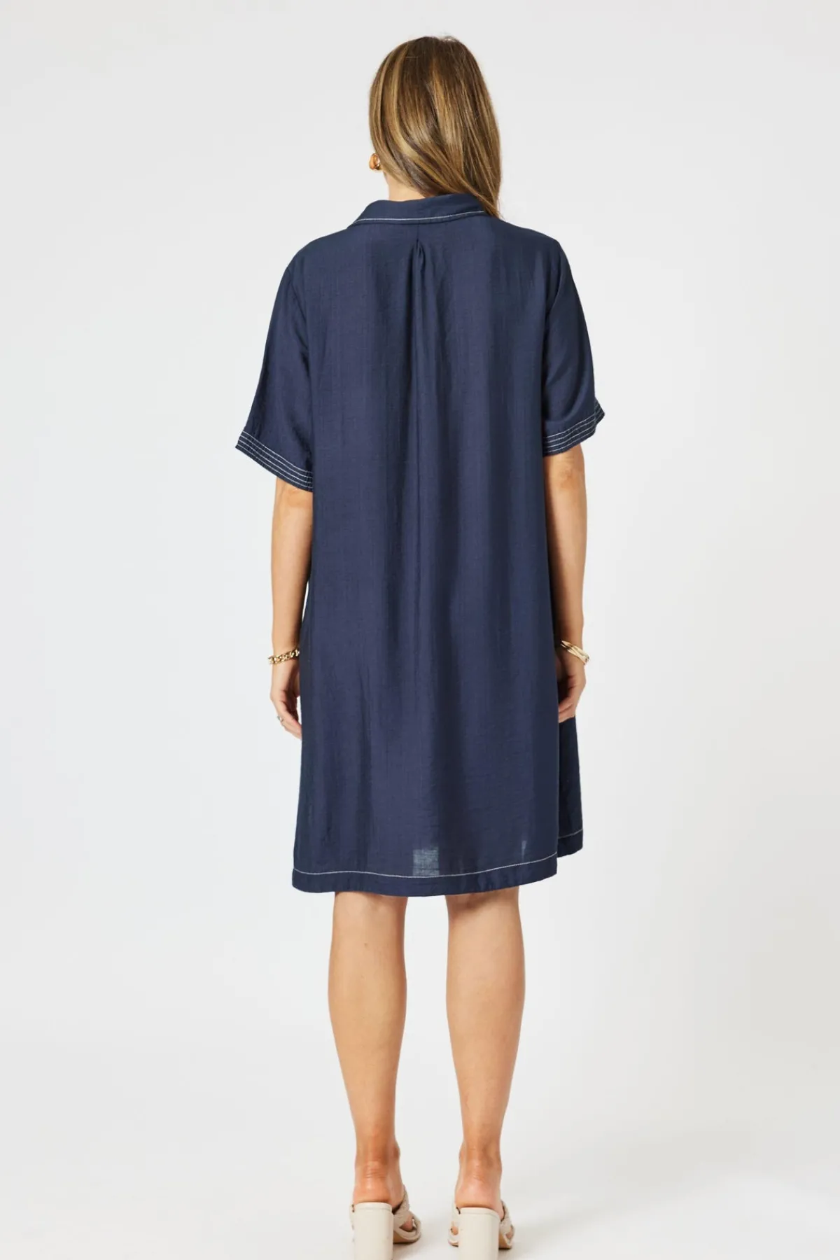 Crafted in a soft, drapey fabric, it features subtle contrast topstitching at the neckline, hem and sleeves for a modern, tailored touch. The relaxed silhouette flows gently over the body, with a flattering knee-length hem and a notched neckline that adds a hint of polish. Designed to move from casual days to easy evenings, it’s the kind of piece you’ll reach for again and again. Just add slides or sneakers for a laid-back look, or elevate it with bold accessories and a heel.