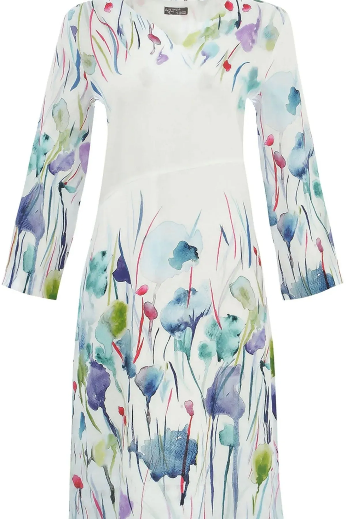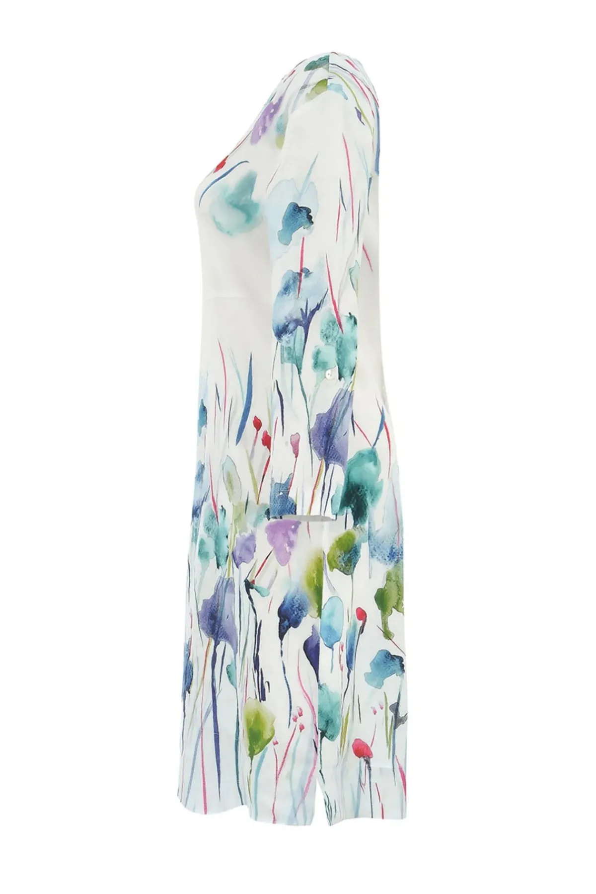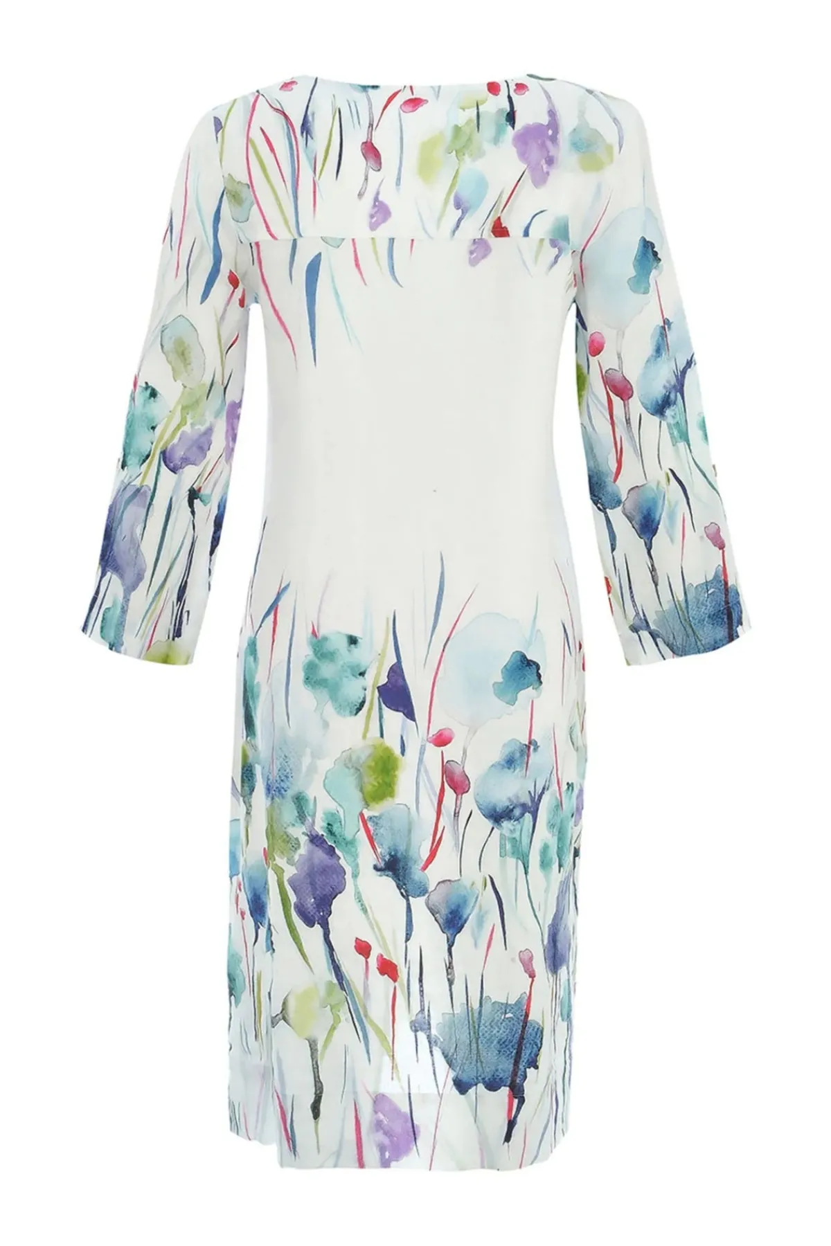This Dolcezza dress, featuring the enchanting ‘Misty Blossom’ artwork by Majella LeBlanc, is a beautiful blend of artistic expression and effortless style. The all-over floral print, inspired by soft watercolour blooms, adds a serene and feminine touch. Crafted from lightweight linen, this tunic ensures breathability and comfort, making it perfect for warm months. The notched neckline and three-quarter-length sleeves provide a sophisticated silhouette, while the asymmetric front seam and side hem splits add modern flair.