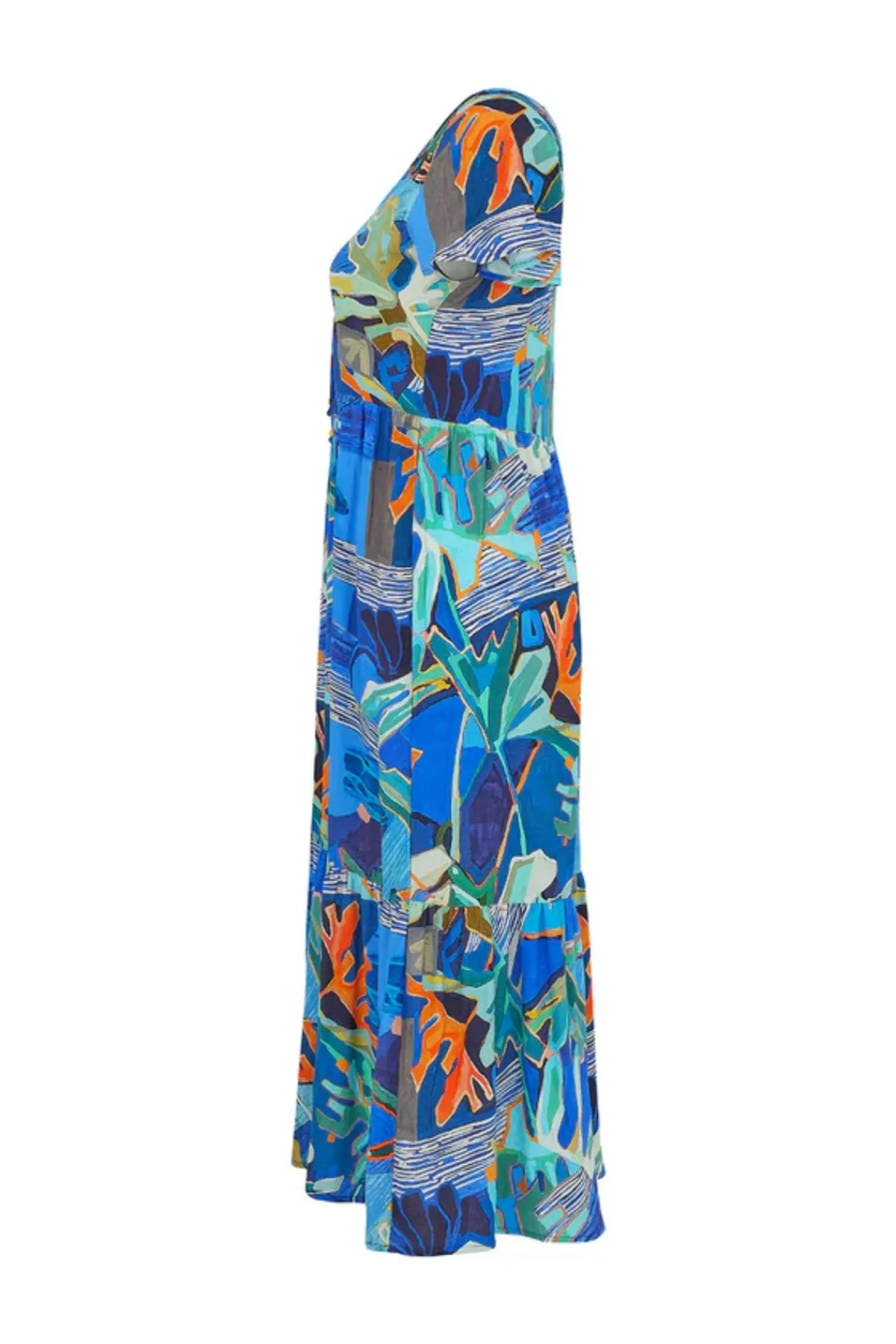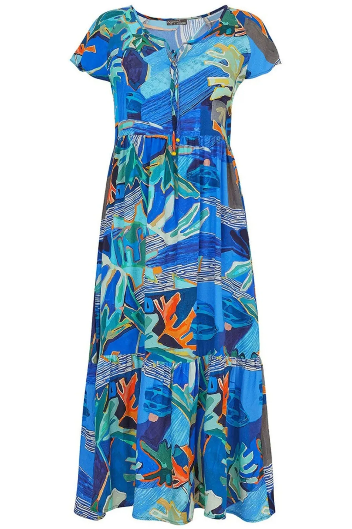 Designed in a flattering A-line silhouette, this Dolcezza dress showcases a vibrant all-over print that exudes artistic charm. The keyhole neckline with a delicate tie detail adds a touch of sophistication, while the cap sleeves offer a light and breezy feel. Crafted from a lightweight fabric for all-day comfort, the dress is finished with a playful ruffled hem that enhances movement and femininity.
