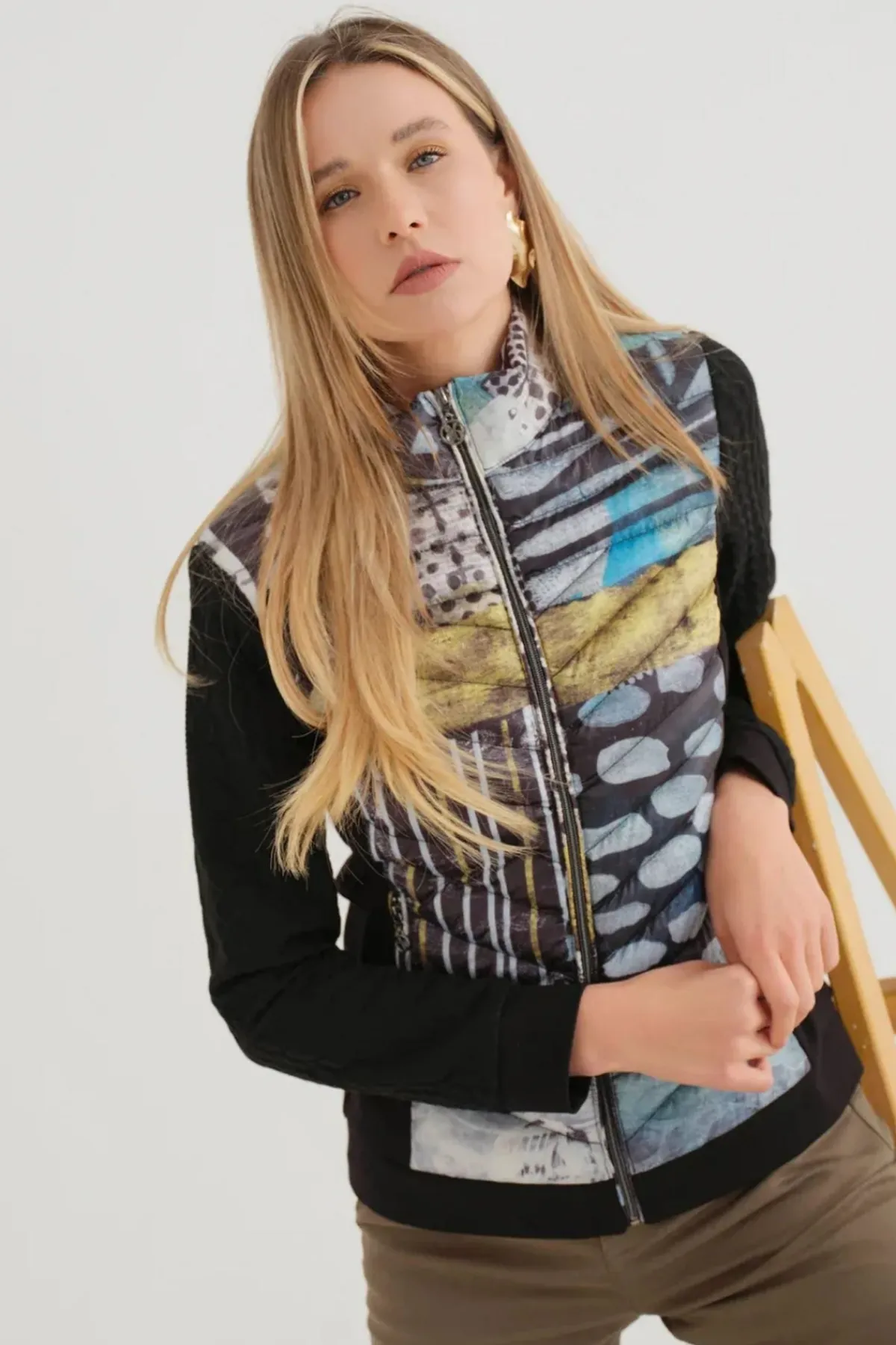 Featuring a high neck and pockets, this lightweight jacket will keep you warm without weighing you down. The knit braided contrast sleeves and black panel contrast hem add a touch of unique style. Stay cozy and stylish this season!