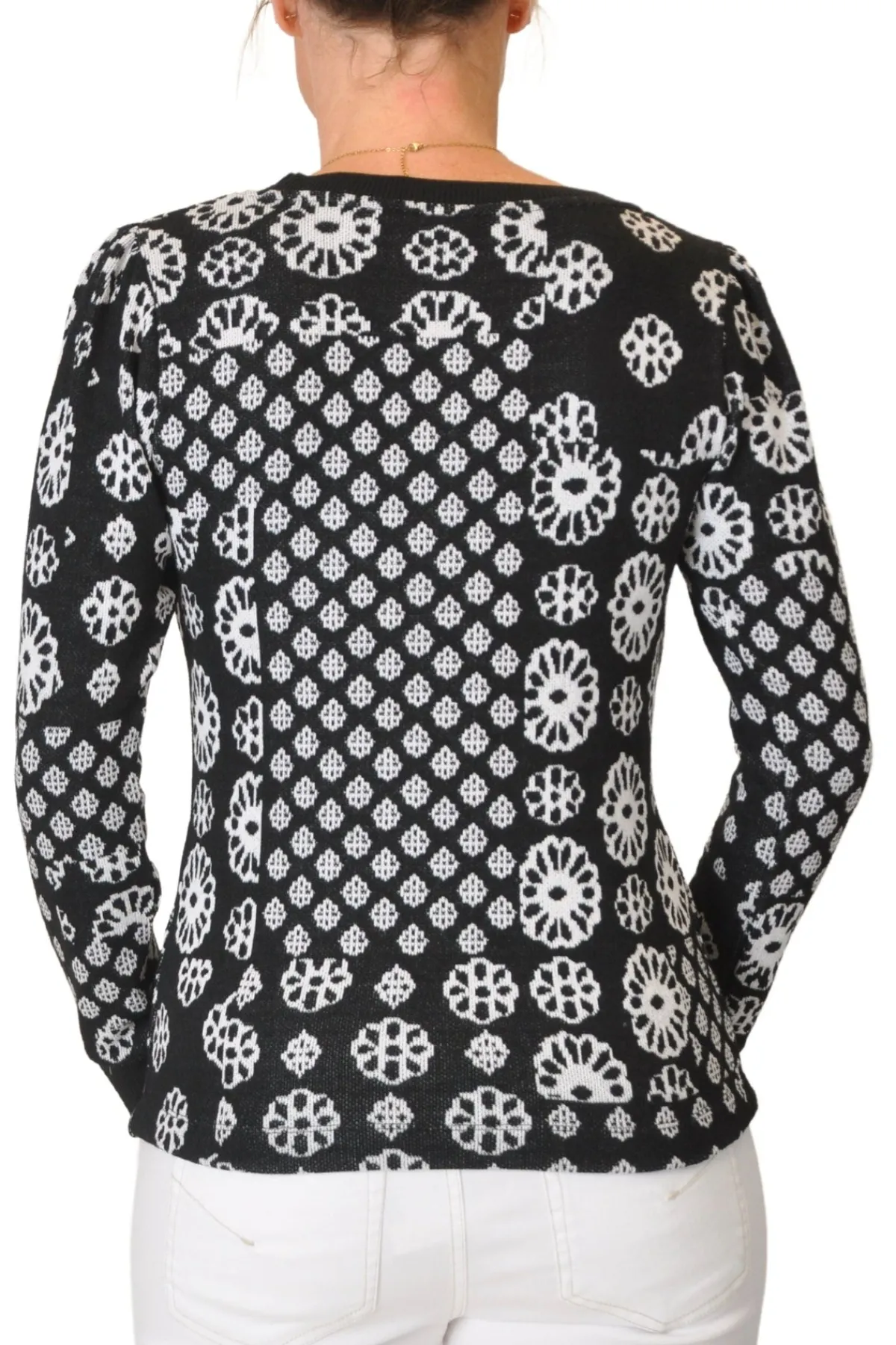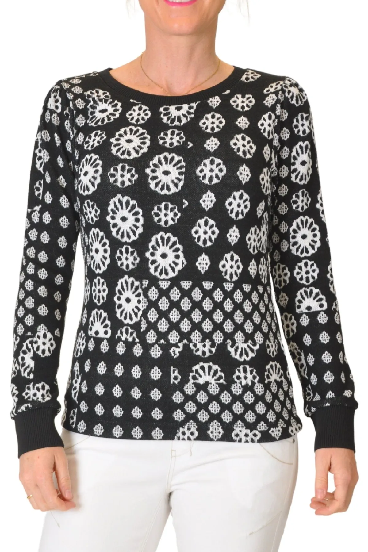 Indulge in luxury with our KNITTED PULLOVER TEE. This must-have piece features a gorgeous black and white floral geometric knit jacquard, perfect for adding a touch of sophistication to your winter travels. With its effortless pullover design, stay warm and stylish on your next adventure.