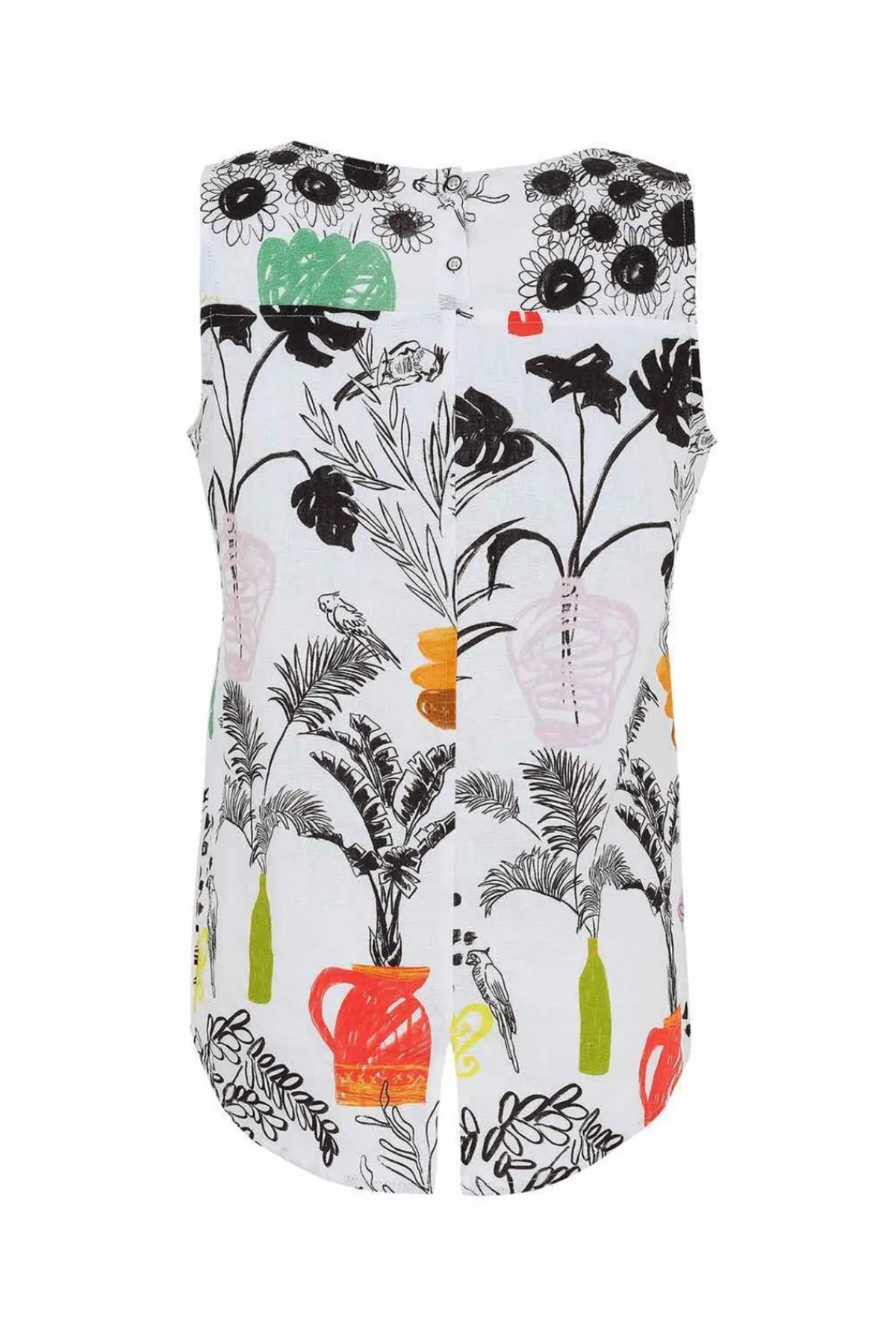 Embrace effortless summer style with our enchanting Botanical Print Sleeveless Top. This breezy top features a captivating print of hand-drawn plants and vases, adding a touch of whimsical charm to any outfit. The relaxed fit and curved hem offer comfortable elegance, perfect for warm days and breezy evenings. Pair it with jeans, shorts, or a skirt for a look that’s both playful and sophisticated.