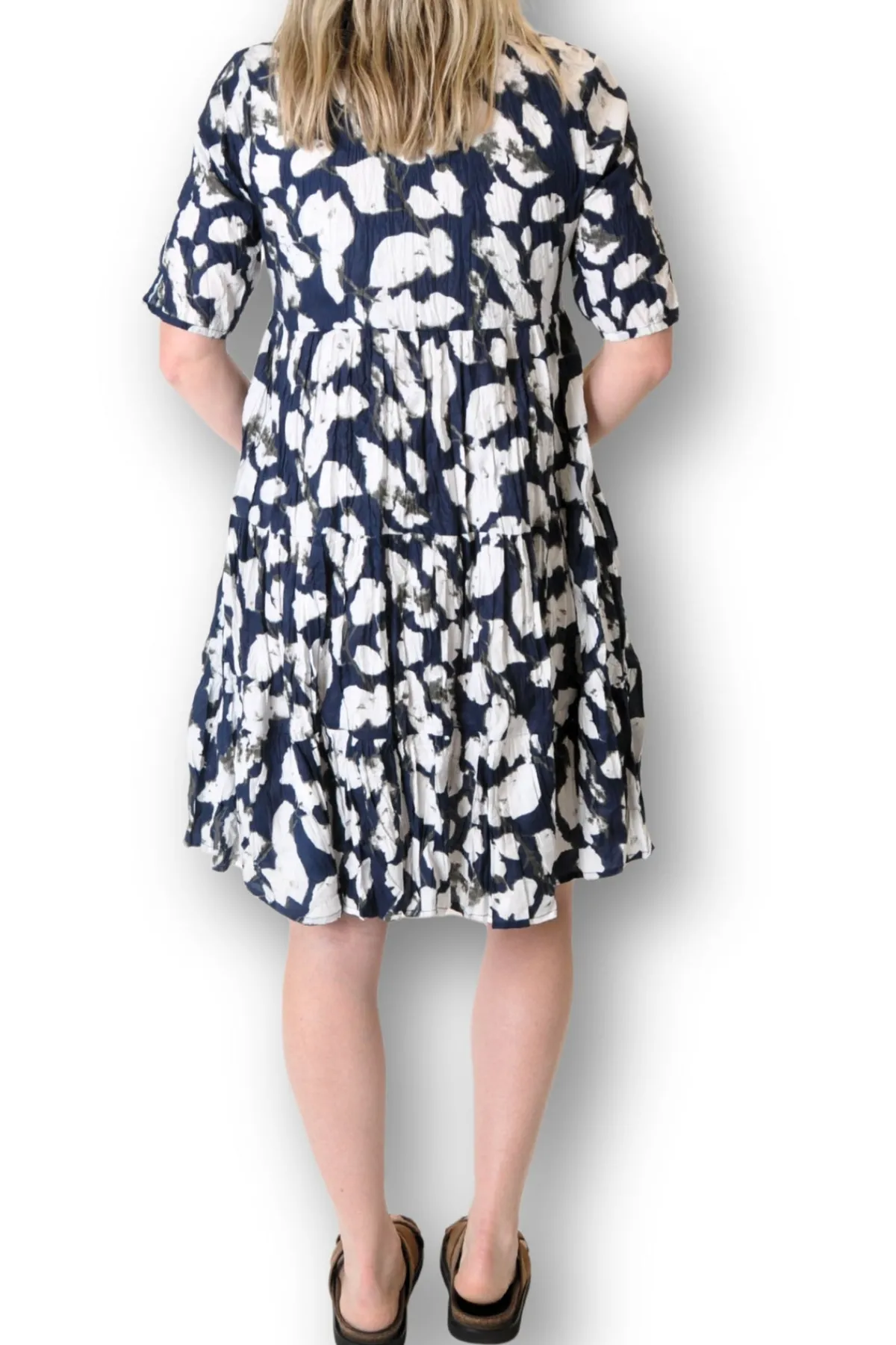 This tiered shirtdress offers a refined blend of style and practicality with its short sleeves and convenient pockets. Crafted from a crinkle-textured fabric, it is effortlessly portable—ideal for travel. The navy and white floral print adds an elegant touch, making it a sophisticated choice for warm-weather occasions where comfort and understated charm are essential.