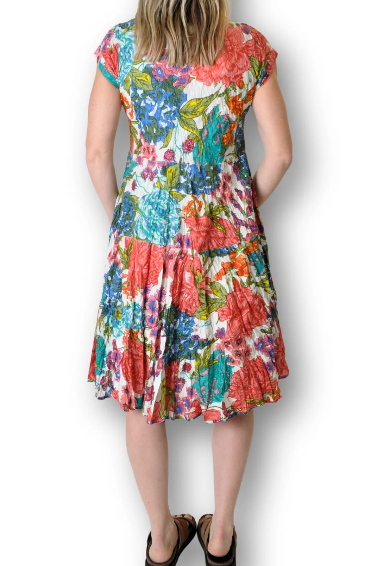 This playful cap sleeve dress in vibrant jade features a flattering v-neck and a breezy knee-length tiered skirt. Crafted from crinkle-effect fabric, it’s perfect for warm summer days and easy travel. Plus, with two handy front pockets, you can keep your essentials close while staying effortlessly stylish.
