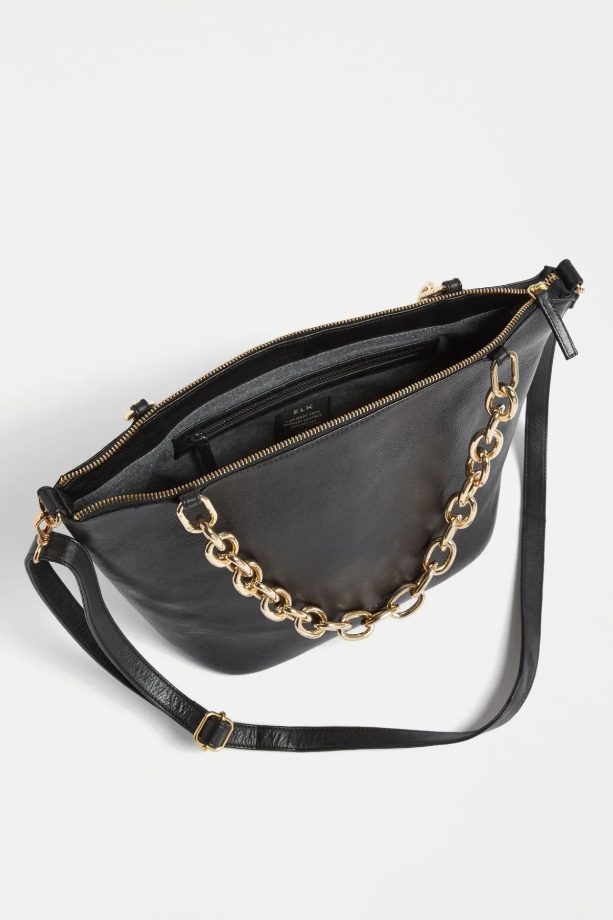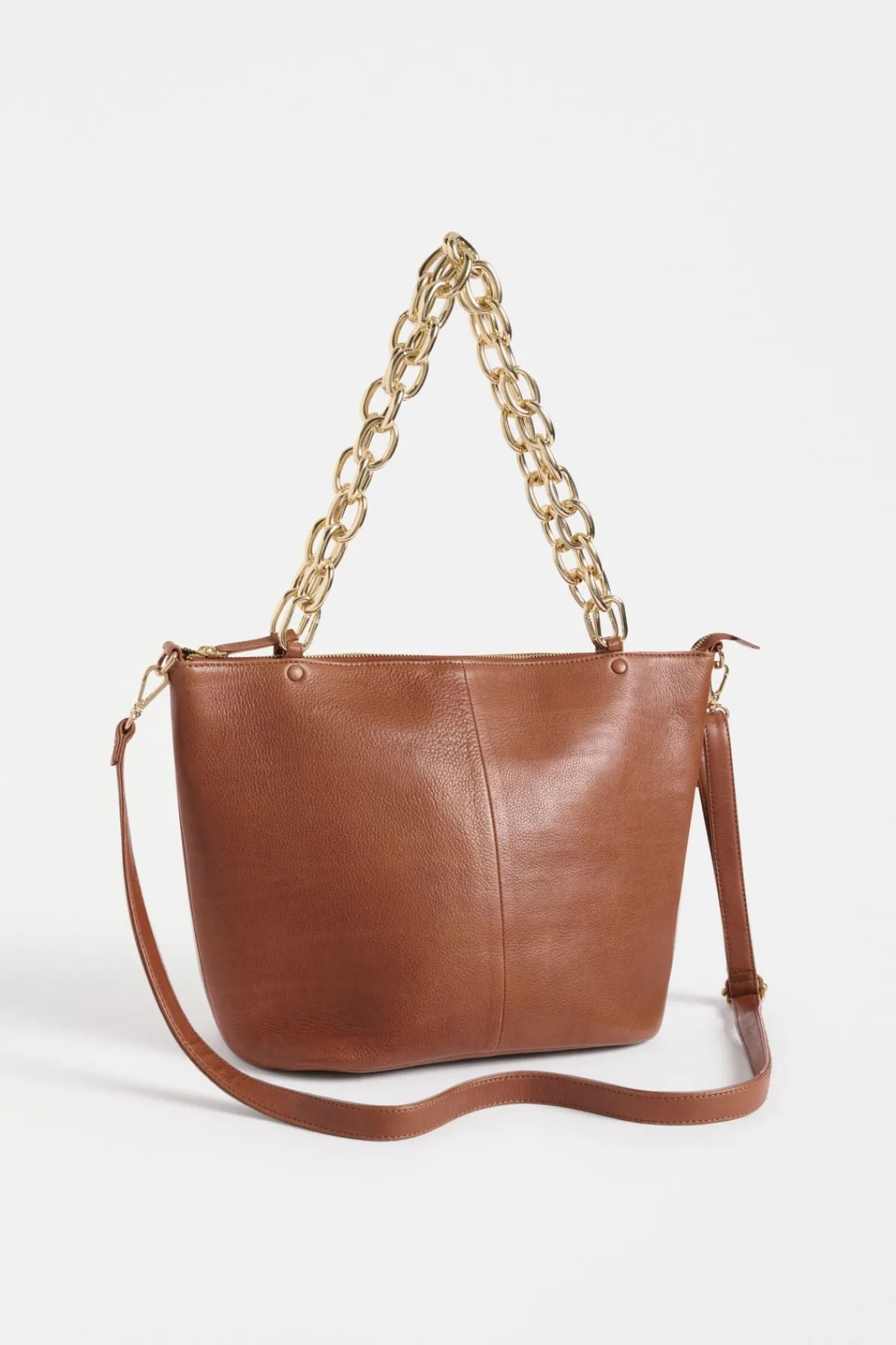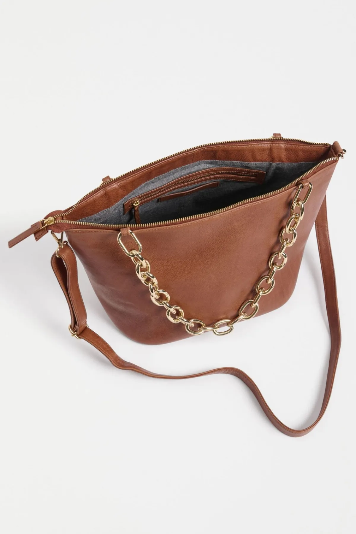 The Lenkka Bag is a classic large tote style with a thick chain strap made from shiny, gold oval links creating a statement, while the removable, adjustable, long leather strap allow for wear versatility. The spacious construction and chain detail make this bag perfect for both everyday functionality and elevated styling occasions.