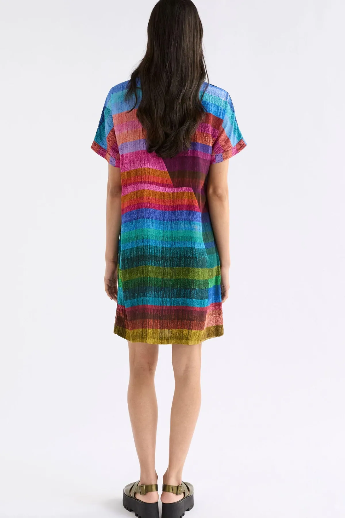 The Sono Dress is a classic, short shift style tee dress in the vibrant multi coloured Komi Print. This easy-to-wear, slip-on, regular fit, day dress features two angled front pockets and round neck with functional button detail on the sides. Crafted from a super soft, lightweight ECOVERO™, an ELK environmentally preferred fibre. Finished with short batwing sleeves, this playful dress will be an easy, to-go addition to your weekend and warm weather wardrobe. Pair with our Jyrti Platform sandal or our Ostt Sandal