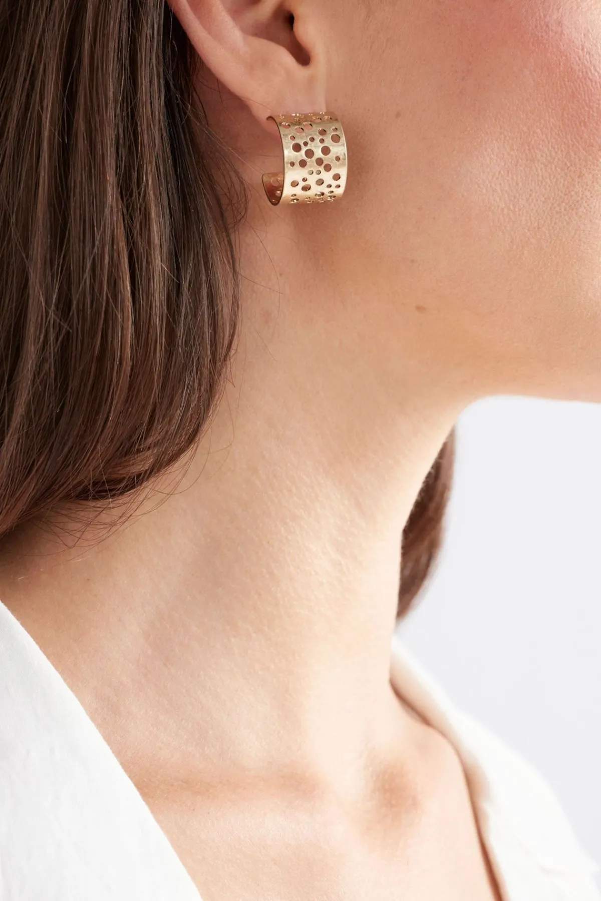 The Hulle Tiny Hoop Earring. Crafted from metal with a unique punched design, the varying hole sizes bring texture and interest to the classic gold finish. With their worn-in feel, they’re a piece you can effortlessly add to any outfit, and trust that they will stand out on their own.