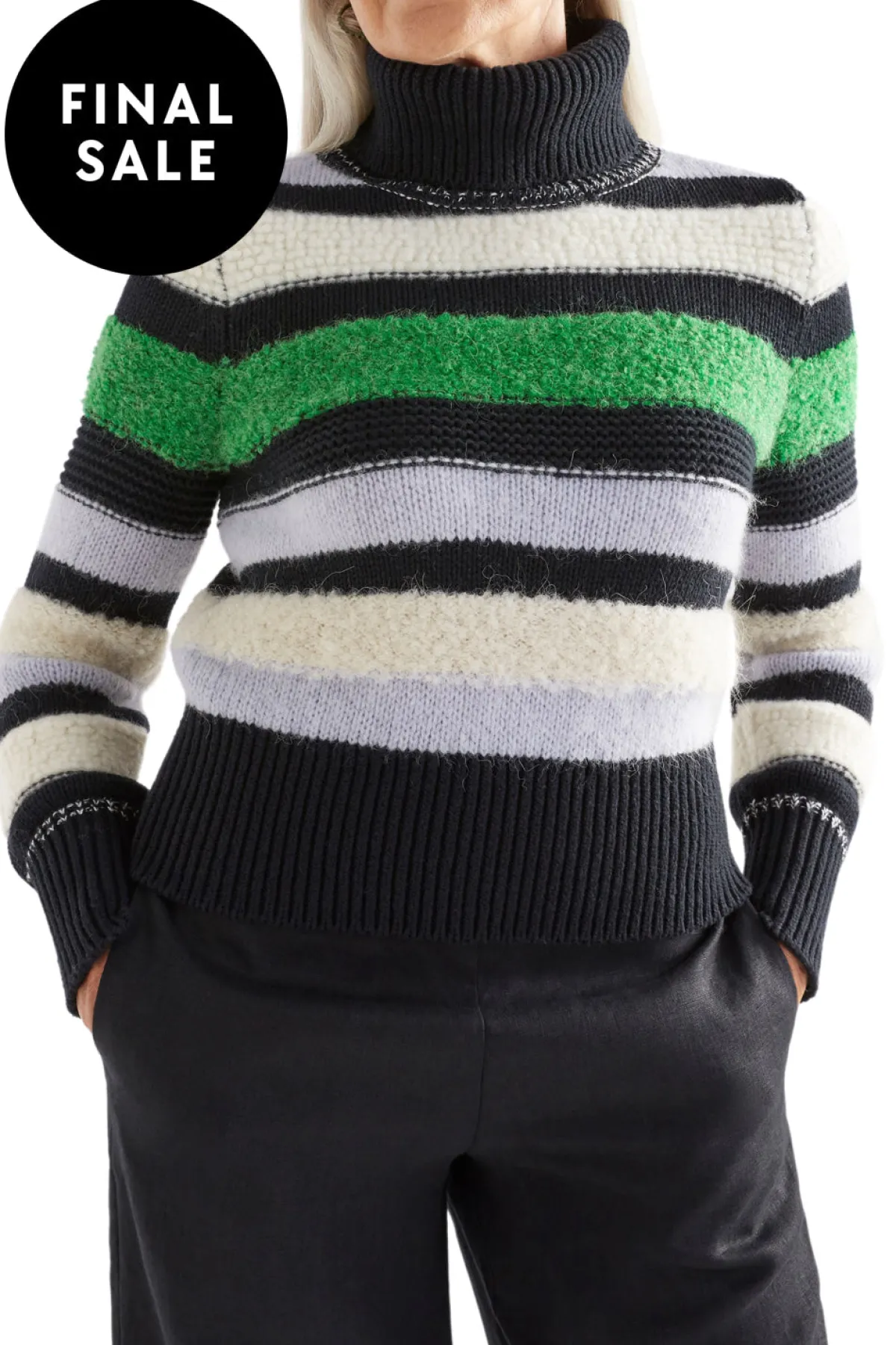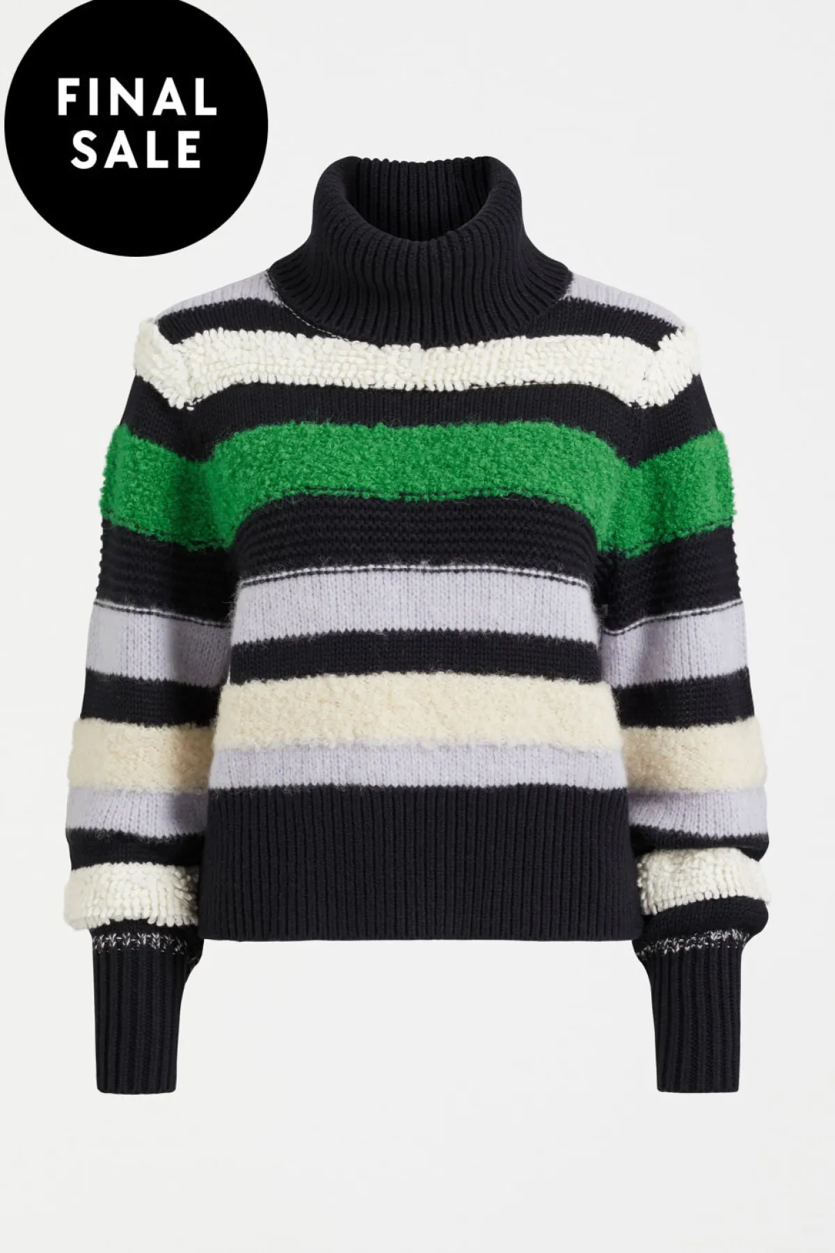 The Olli Sweater is a slightly cropped sweater featuring a ribbed roll neck and a long, set-in sleeve with a wide ribbed cuff. The feature of this design is the multicoloured and multi-stitch design, which creates varying textures on the sweater. Crafted from a blend of yarns, this sweater has a unique combination of smooth and fluffy finishes.