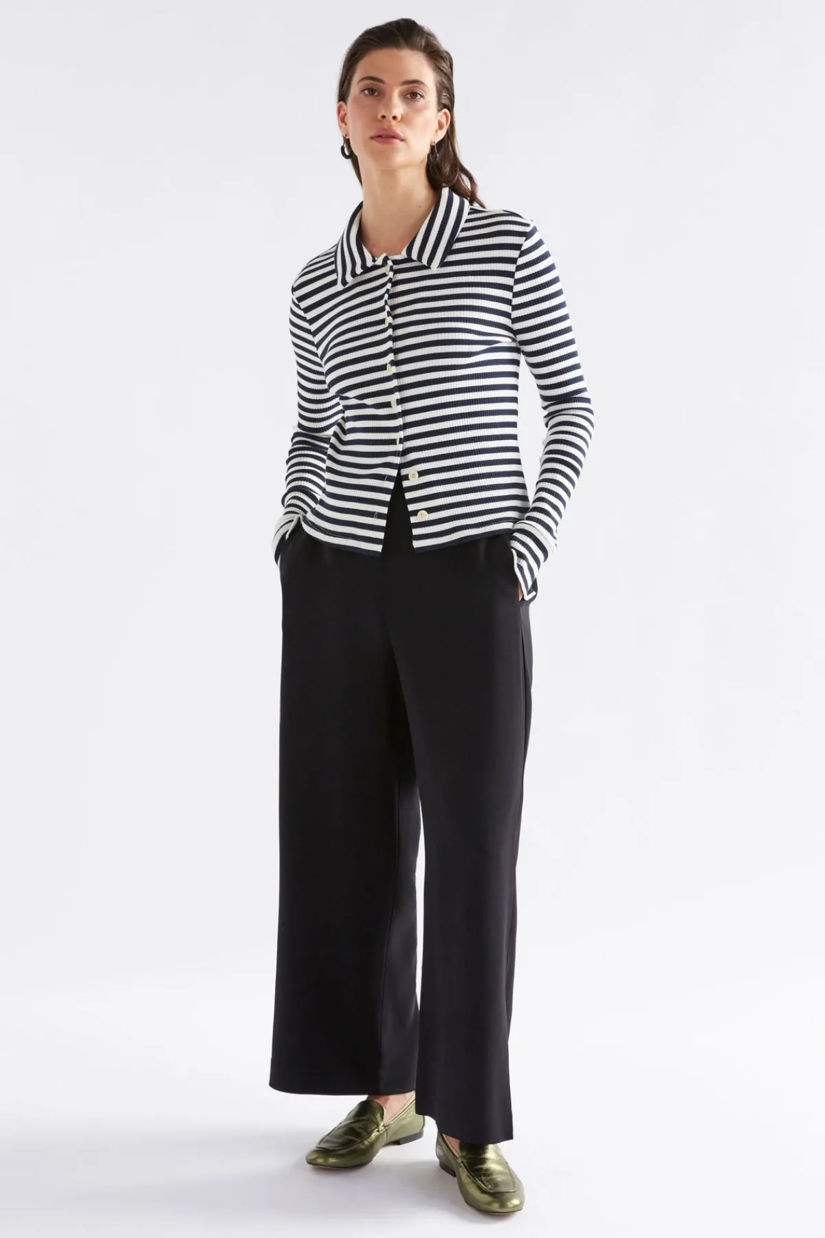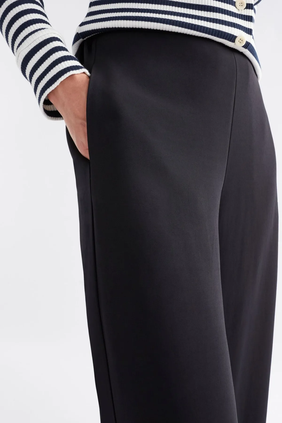 The Alden Pant is a regular fit through the waist, with an elasticated waist that offers ease and movement. The pants continue into a regular fit through the hip, and into wide leg openings. The waistband conceals an internal waist tie which allows for a customised fit.