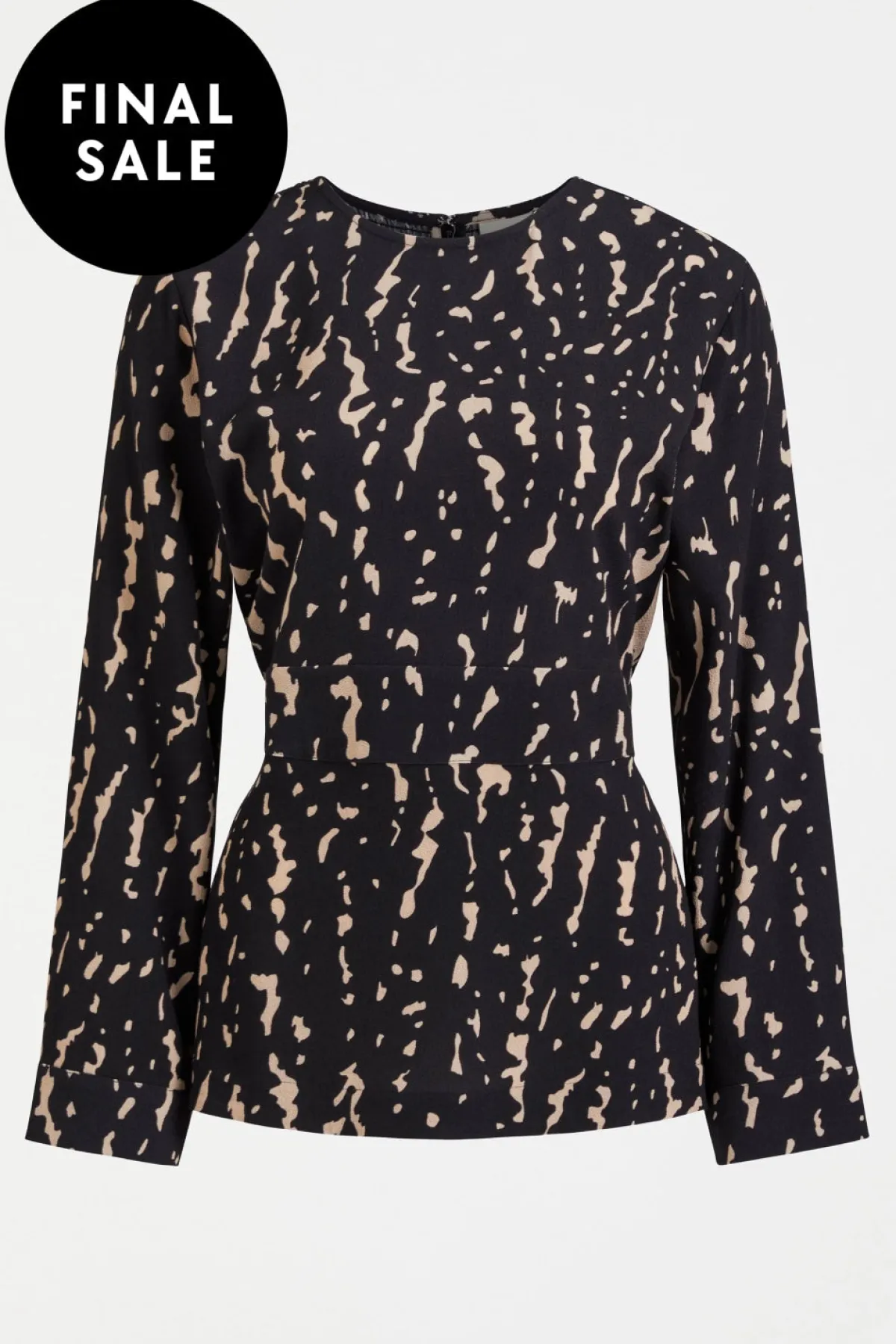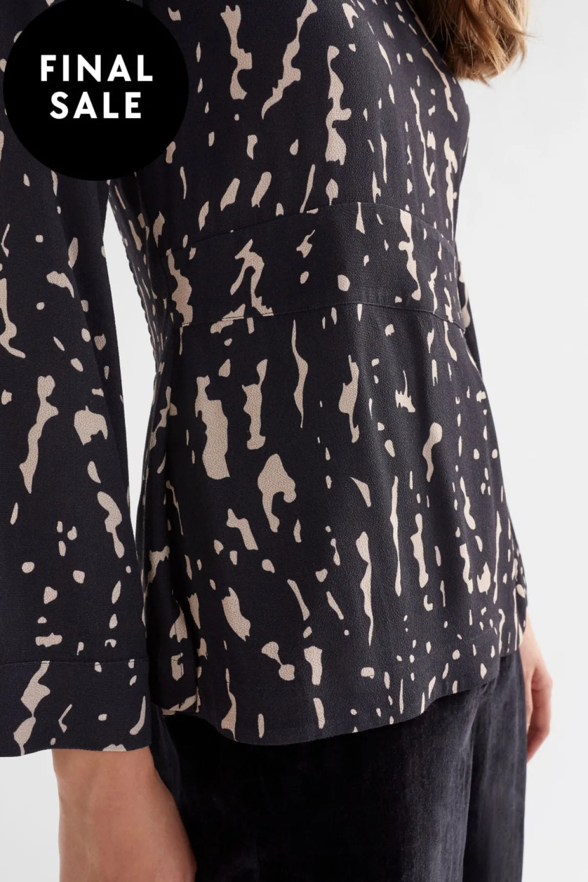 The Solina Top is a crew-neck top with a back shirring panel for interest. The top features a waistband at the front and side splits at the hem. The long, slightly wider sleeve has a fixed, wide cuff, and there is a zip at the centre back for access. While the shirring gives some flexibility through the upper back, the waistband is fixed. Crafted from a textured blend of ECOVERO™ Viscose and Naia Acetate, this shirt has a soft drape and a crepe-like feel.