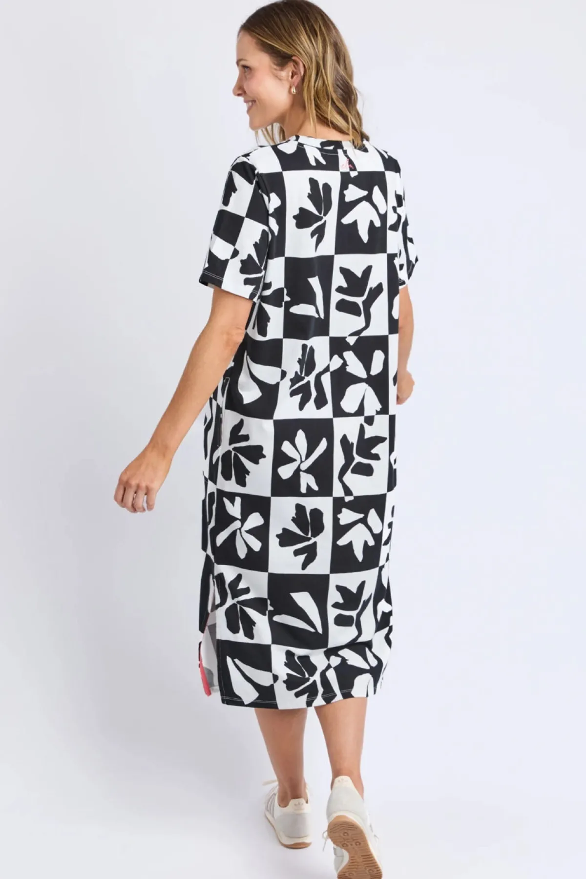 Effortless style meets everyday comfort in the Splice Dress. This relaxed tee shirt dress features a simple, flattering silhouette that works for any occasion—from casual outings to weekend errands. Short sleeves keep you cool, while practical side pockets add functionality without compromising the clean aesthetic. The striking black and white print makes a subtle statement. Simply throw it on and go—no fuss required. Perfect for those mornings when you want to look put-together without the effort