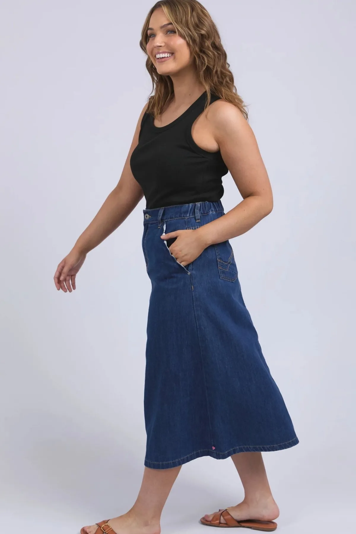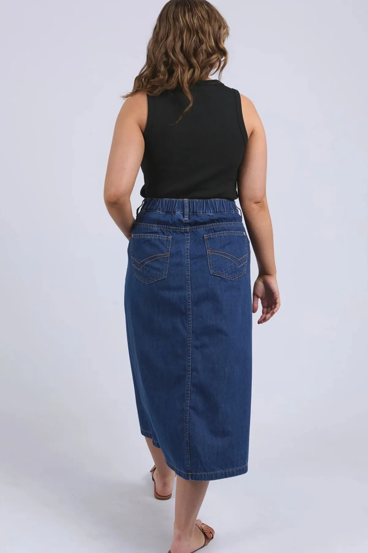 Elm’s Scallop Edge Denim Skirt combines classic style with charming details. This mid-blue midi skirt features distinctive scallop-edge pockets and a comfortable elastic back waist, making it effortlessly versatile for everyday wear or weekend outings.
