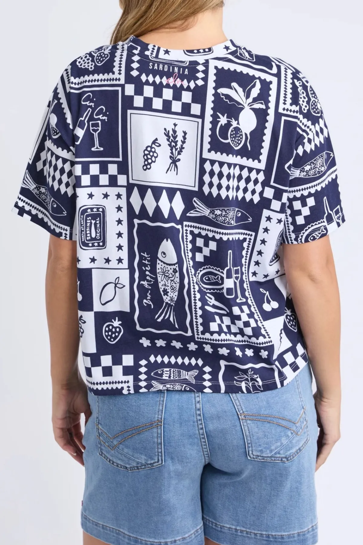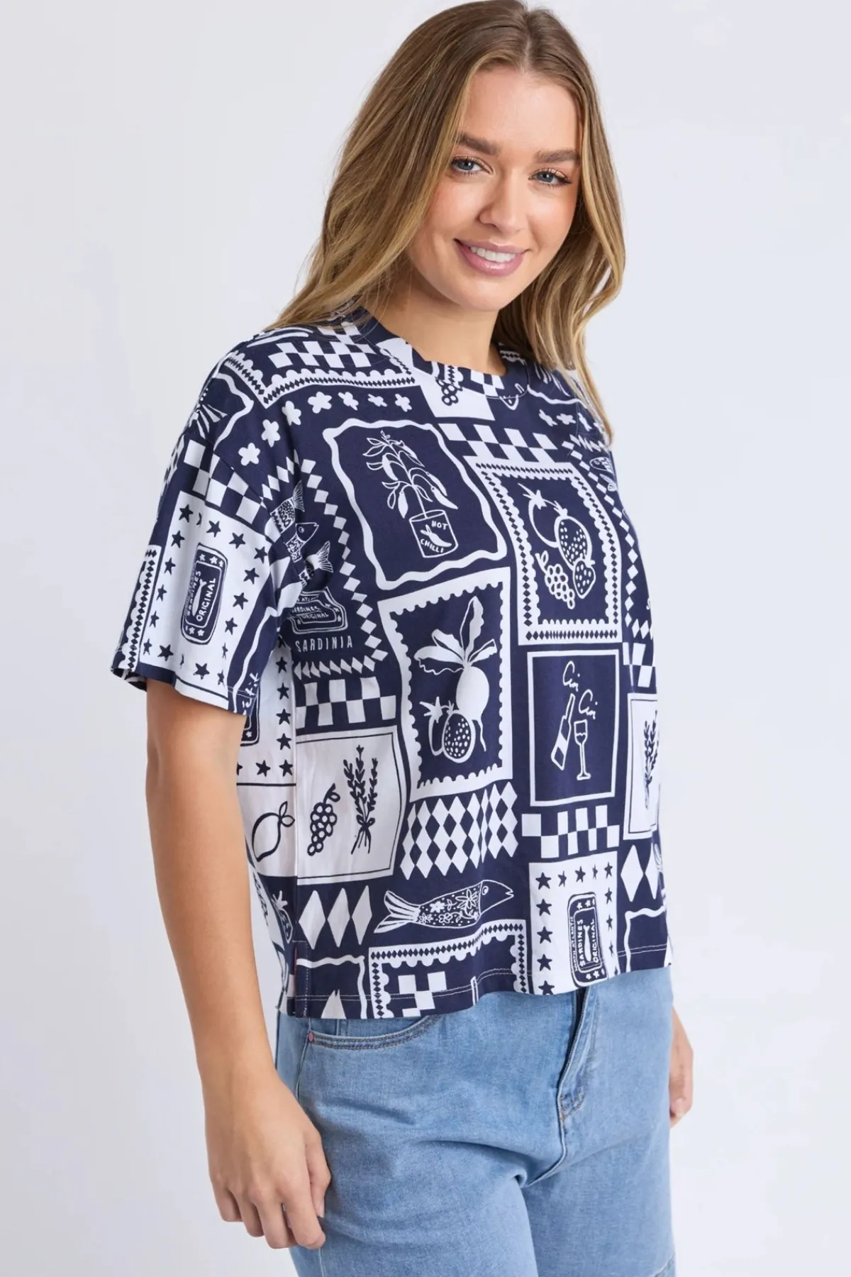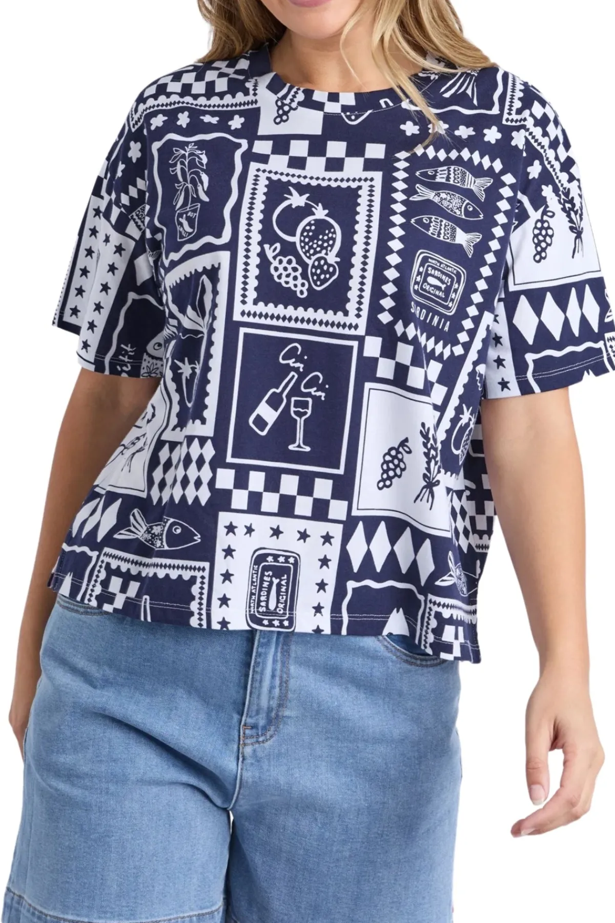 This Chin Chin Tee Shirt features an exclusive yardage print that adds a unique touch to your casual wardrobe. Elevate your look with this distinctive tee that effortlessly blends bold patterns and fun spirit!