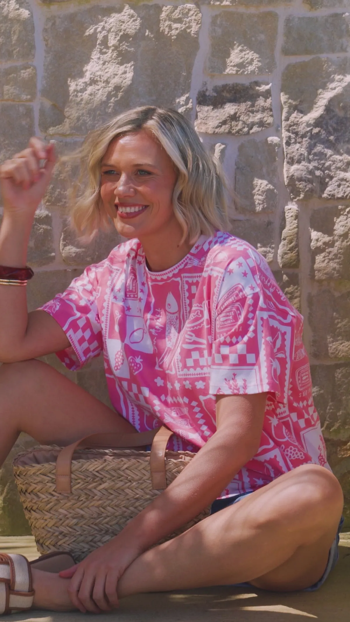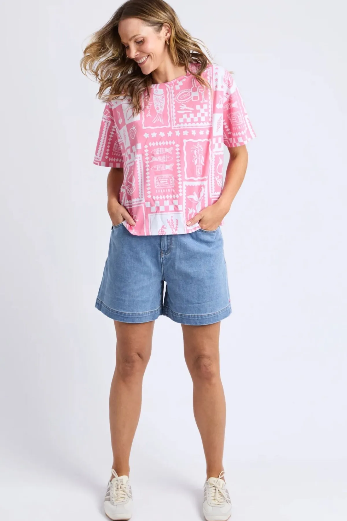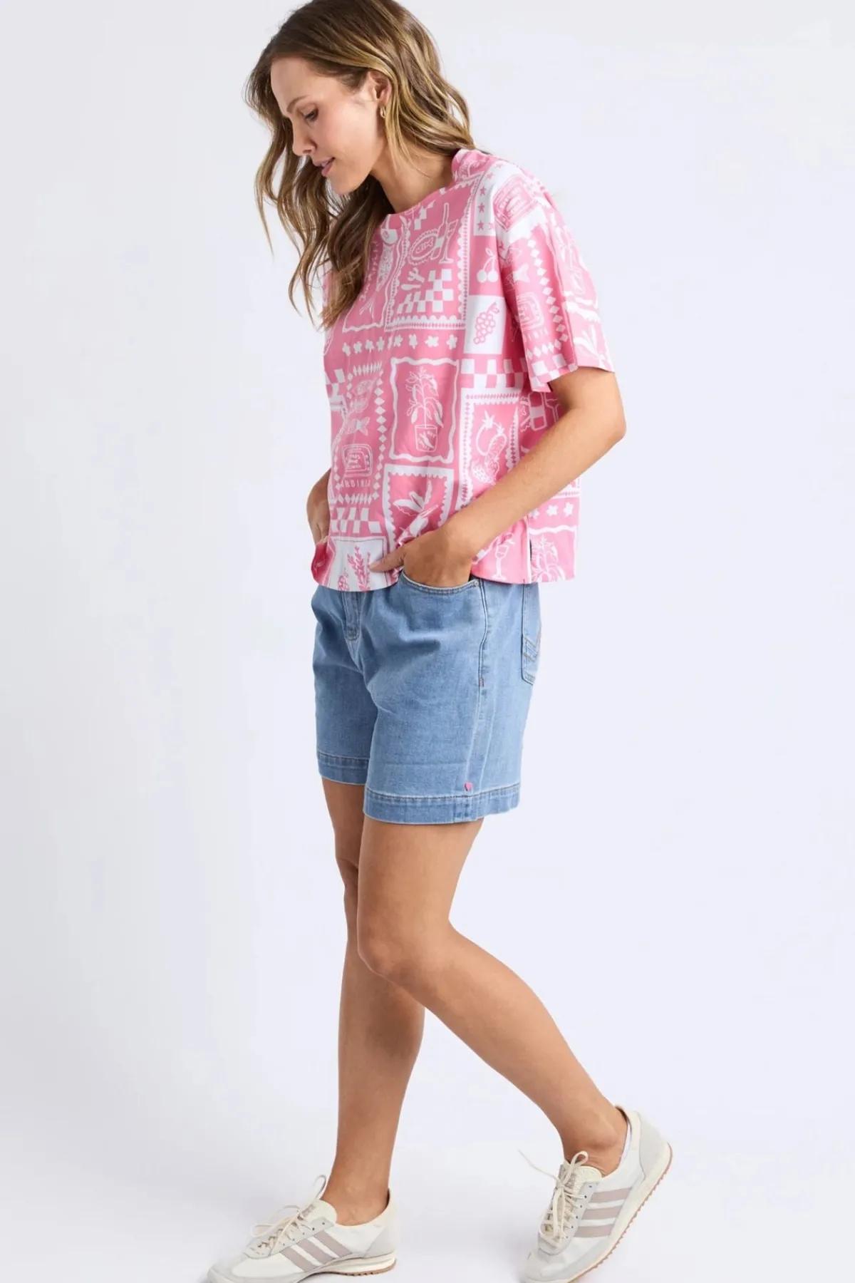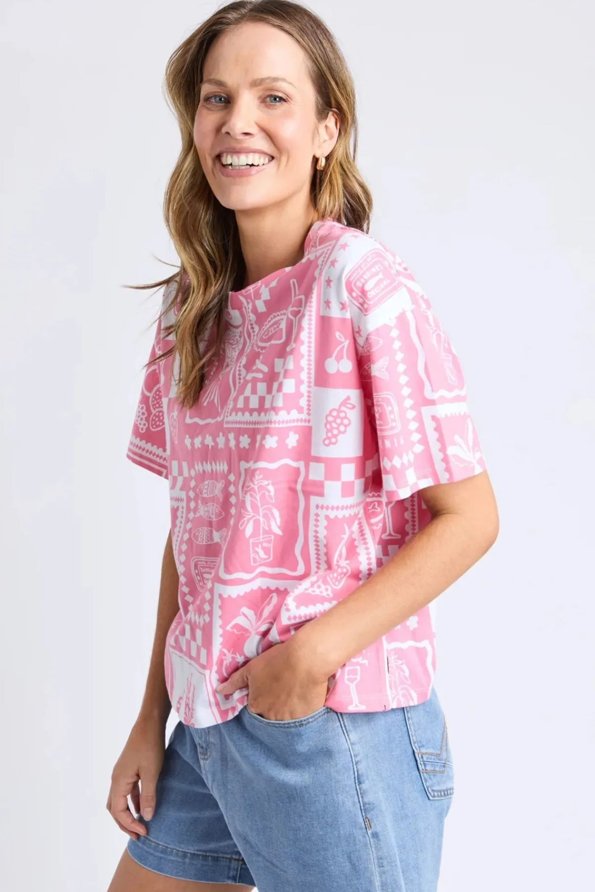 This Chin Chin Tee Shirt features an exclusive yardage print that adds a unique touch to your casual wardrobe. Elevate your look with this distinctive tee that effortlessly blends bold patterns and fun spirit!