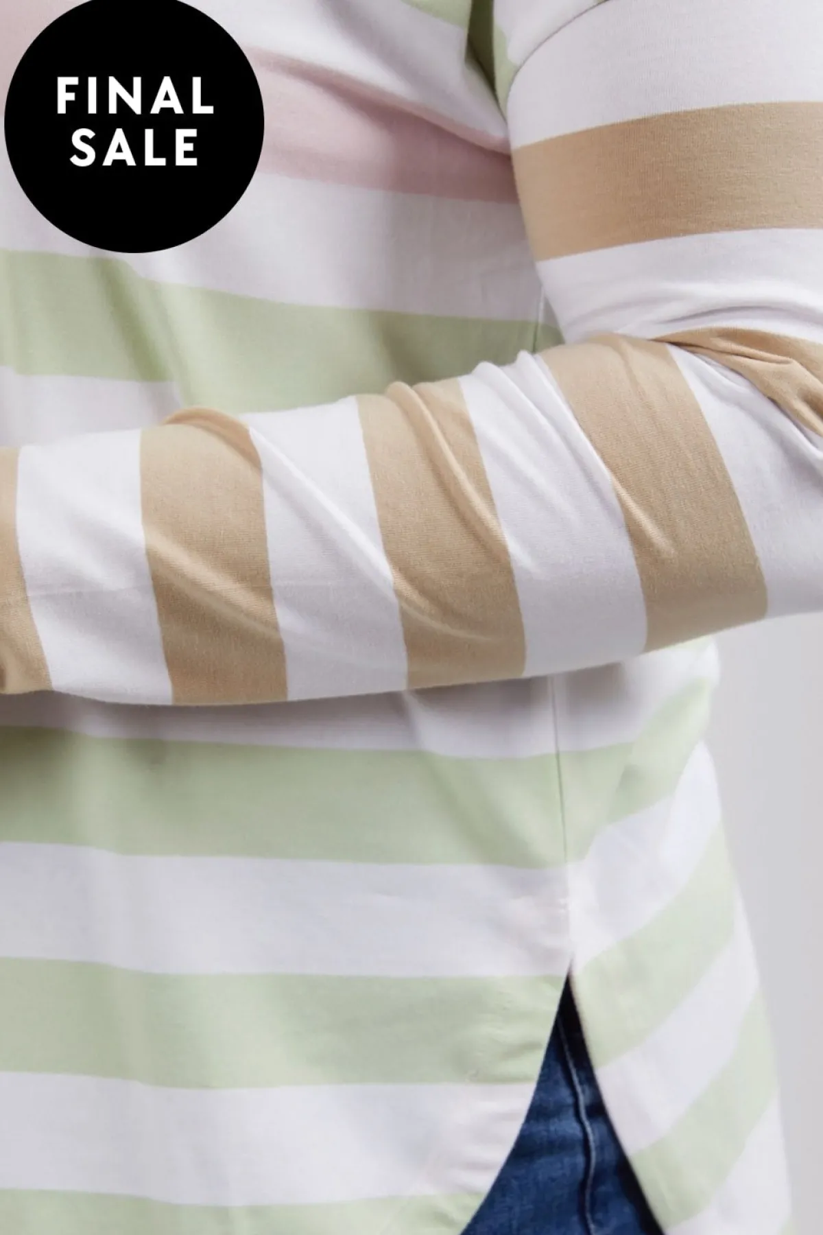 Fantastic long sleeve tee for everyday wear. Featuring gorgeous soft hued stripes and a scooped hemline making it ideal for layering under your favourite crew or wearing by itself atop your favourite denim.