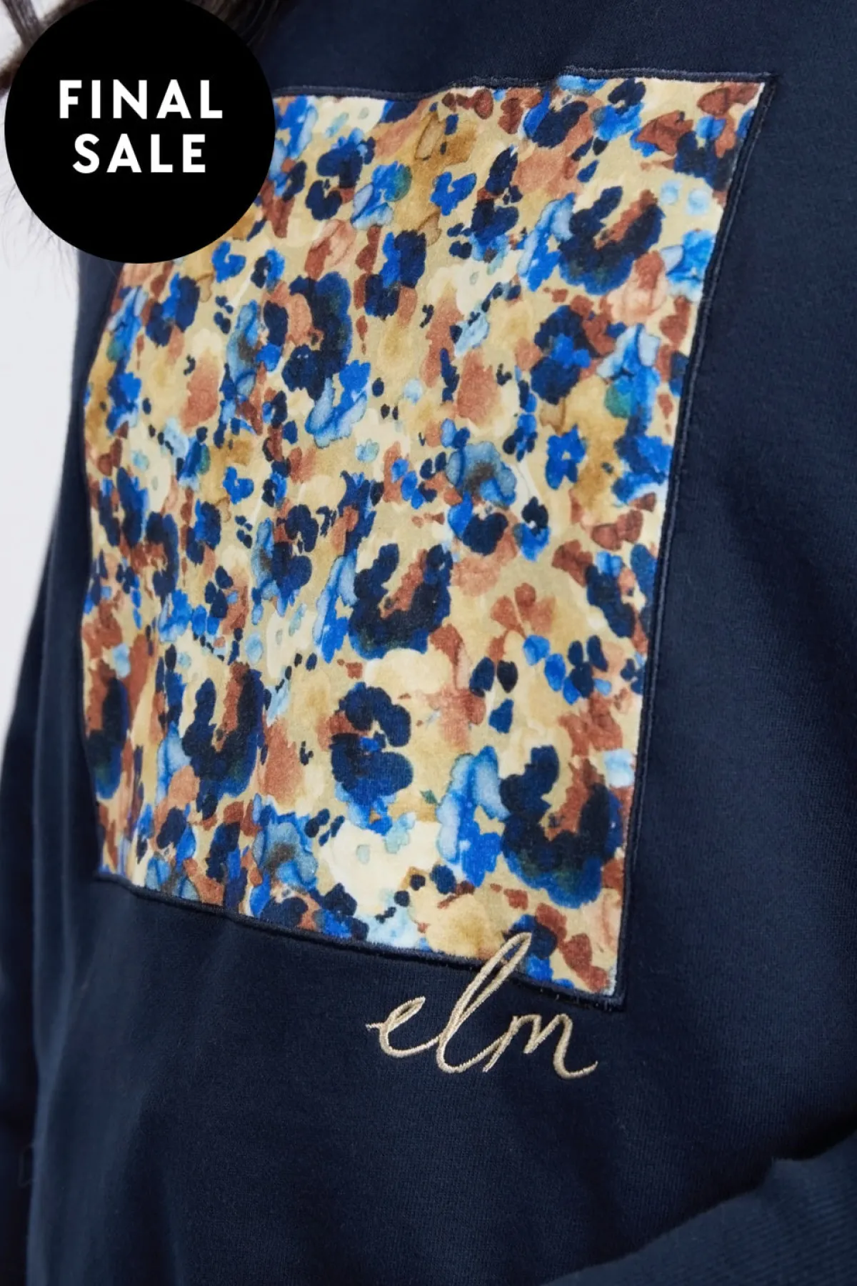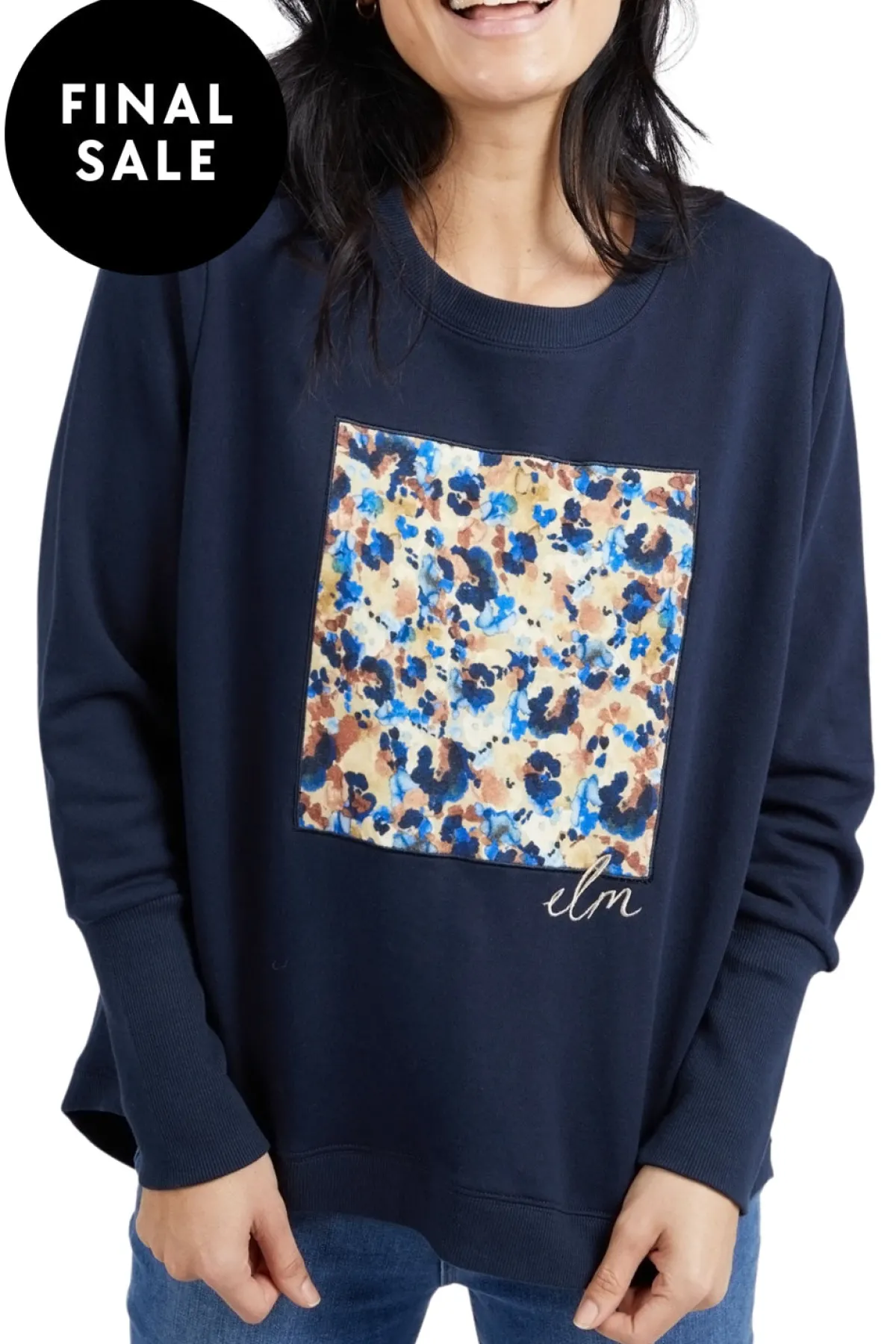 Featuring an exclusive Elm print on the front this classic navy crew will fit seamlessly into your wardrobe this season. The extra wide cuffs and scooped hem provide the ultimate in flattering style and make this crew perfect for everyday wear.