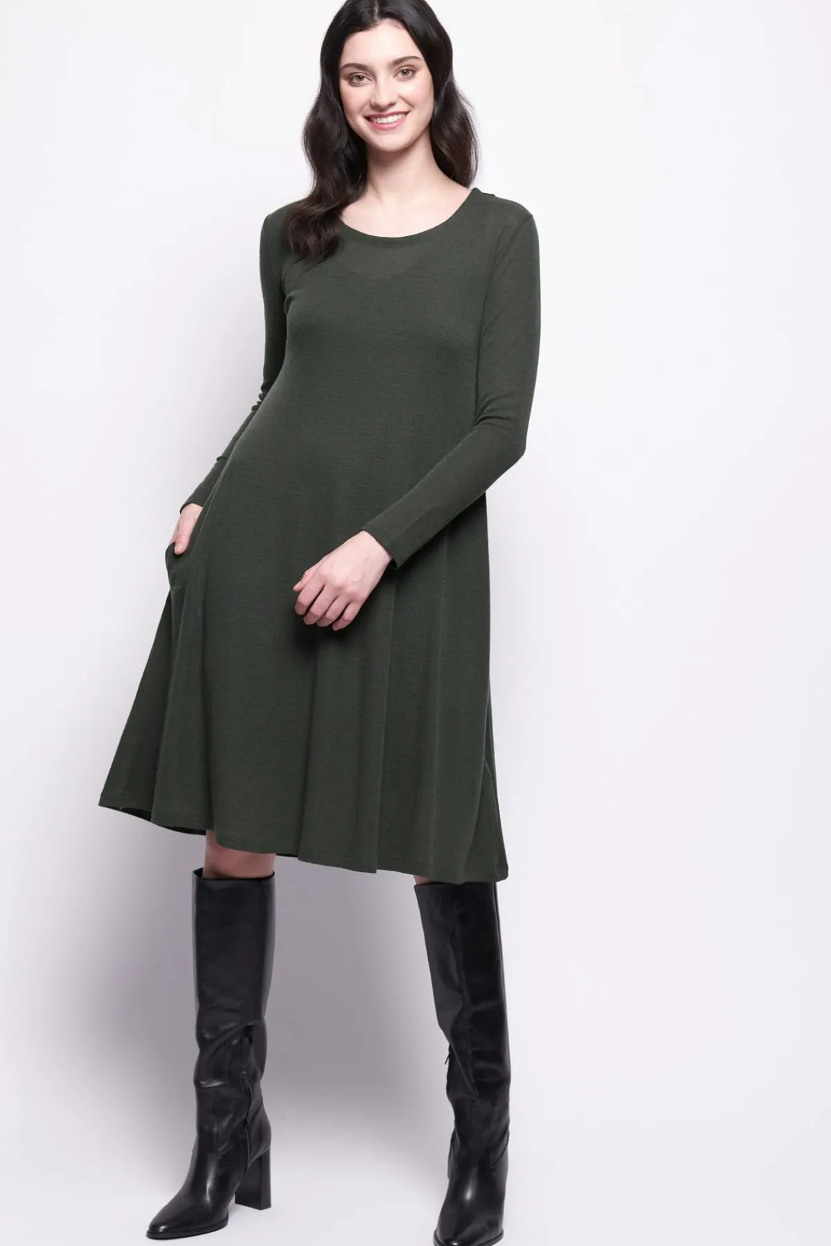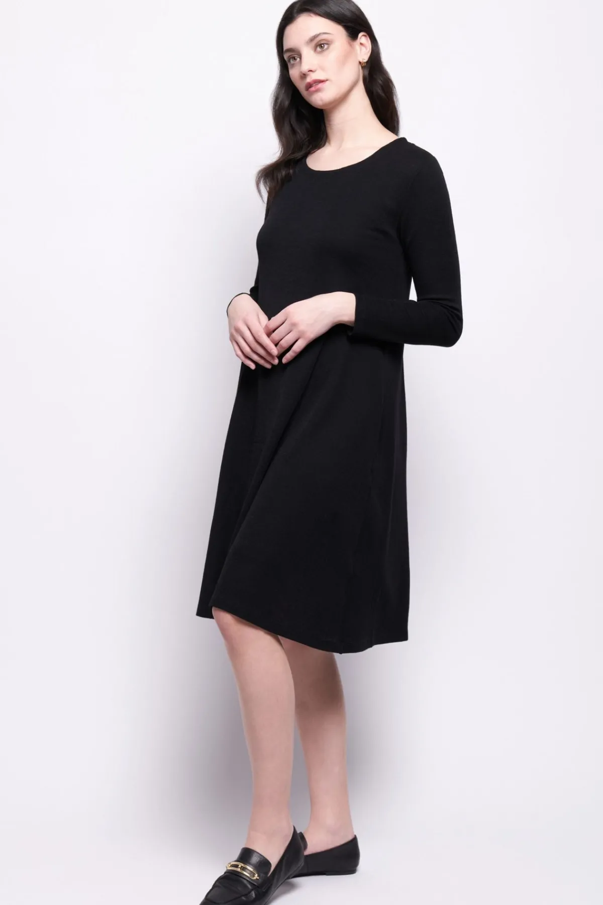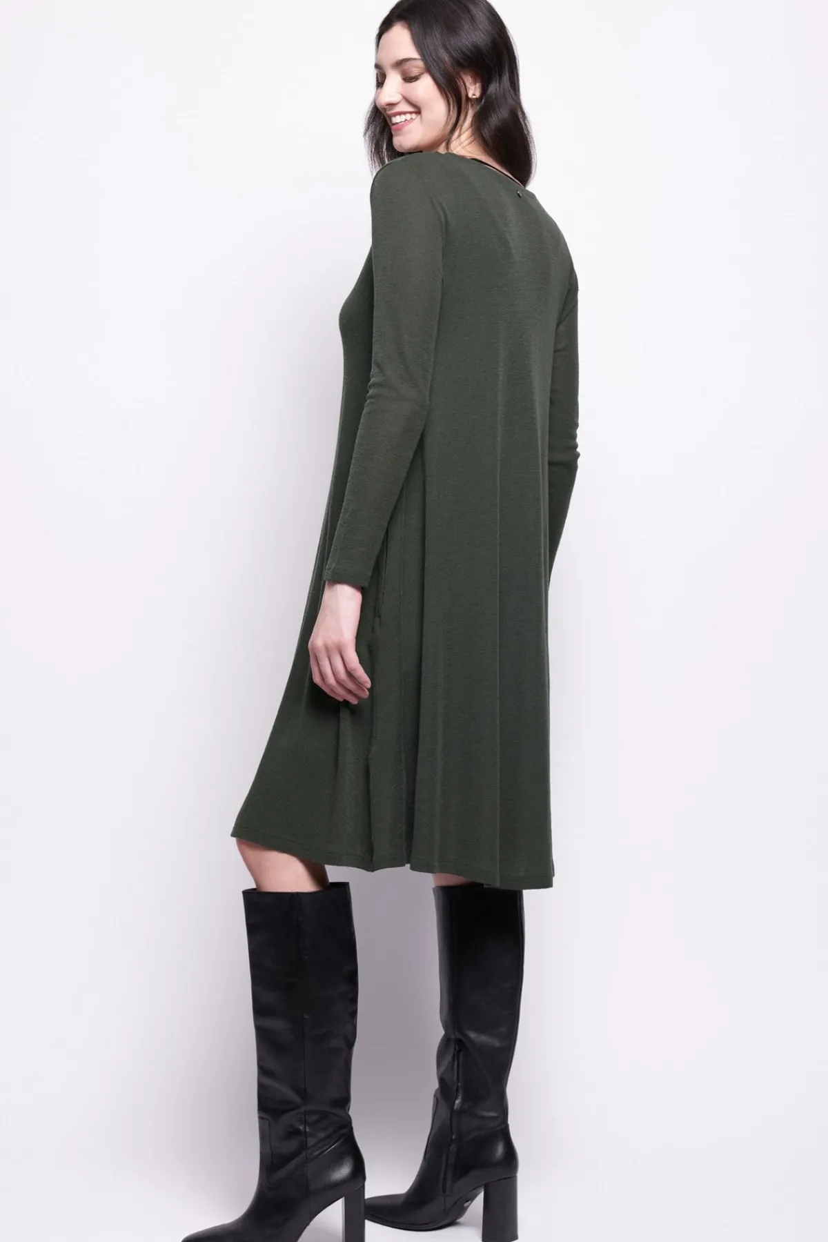 Crafted from a lightweight, flowy fabric, this dress drapes beautifully, offering a flattering and comfortable fit. Whether paired with sleek boots and delicate accessories, this piece is a timeless addition to your collection.