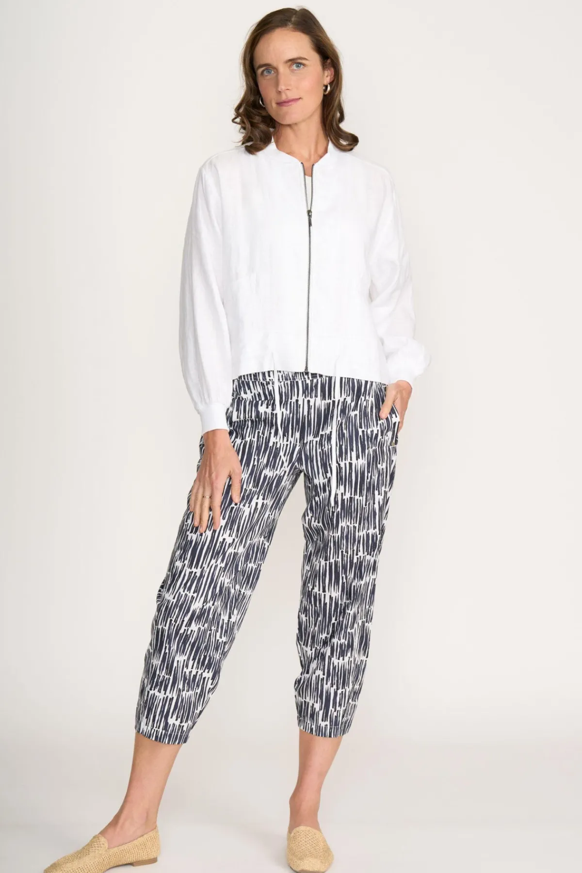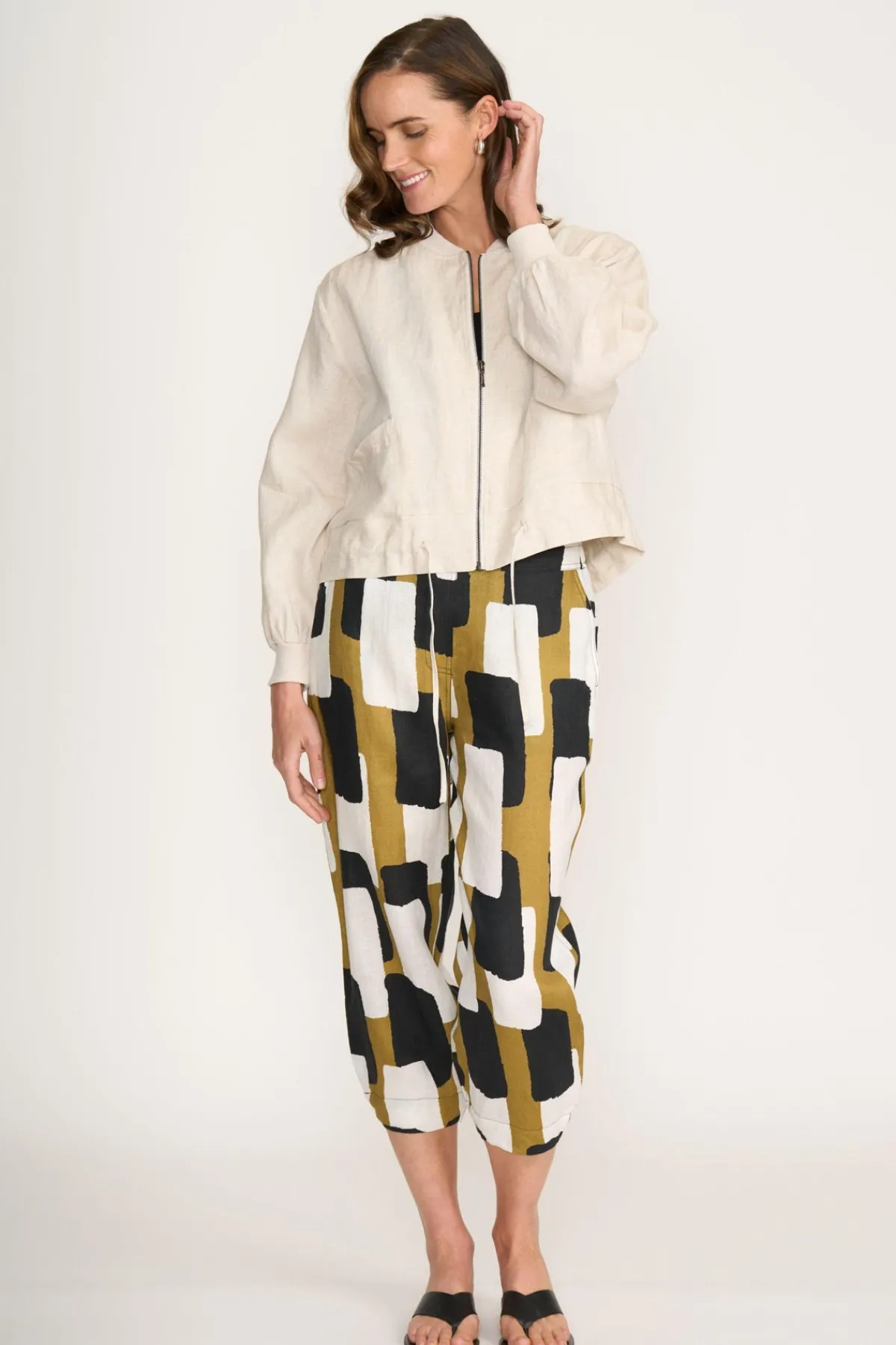 Experience effortless style with the Natural Ability Jacket, a sophisticated take on the classic bomber. Crafted from breathable linen, it features ribbed neckline and cuffs for subtle texture, functional front pockets, and a drawstring waist to tailor the fit. Its cropped length adds a modern edge, making it the perfect weekend companion for refined comfort and versatile layering.