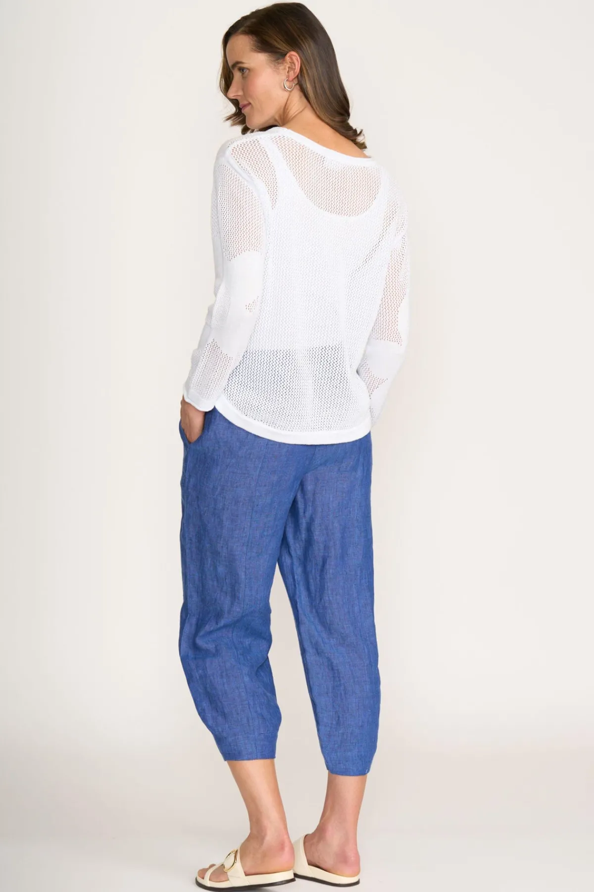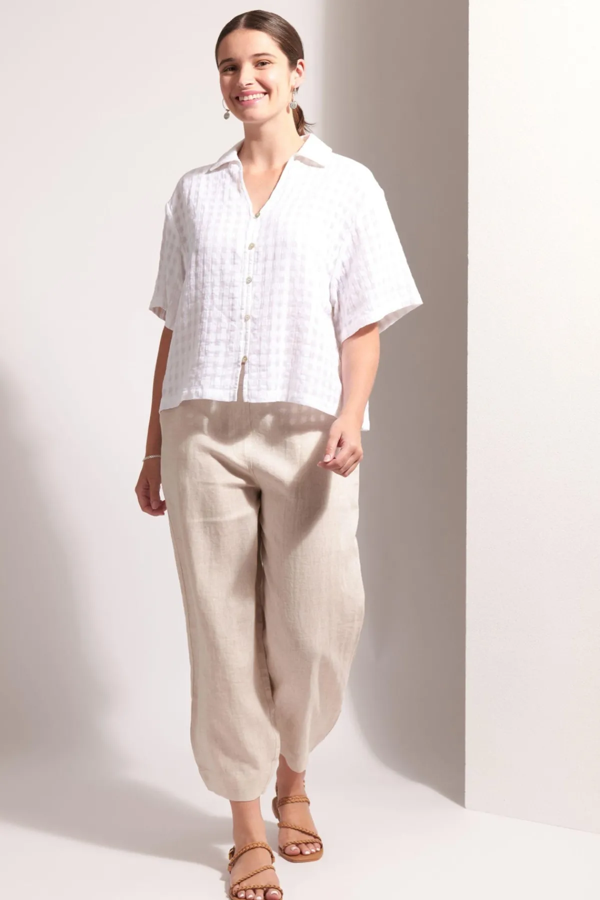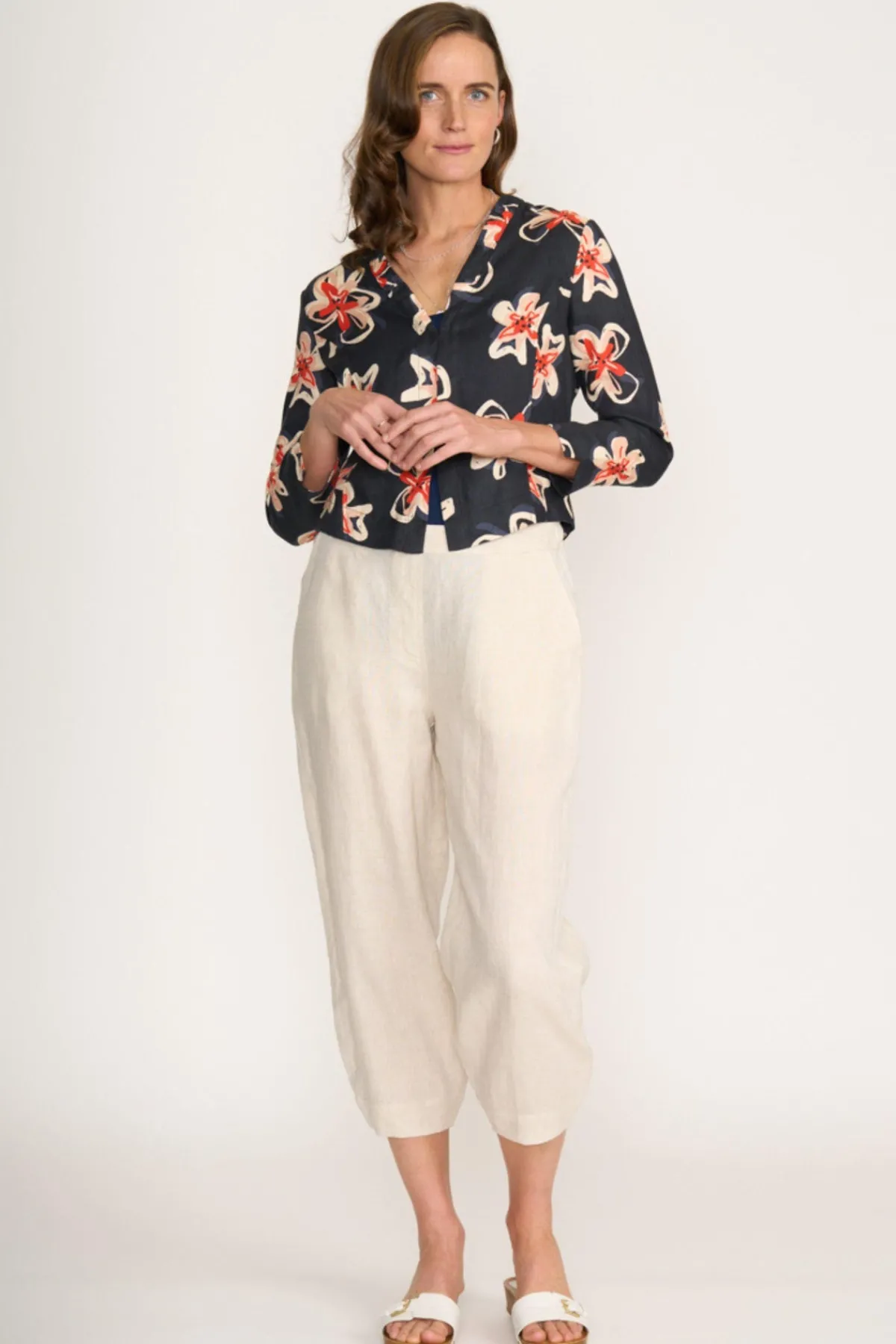 Experience effortless sophistication with the Jubilant Pant. Designed with a flat front waist and an elasticated back waistband, these linen pants combine comfort and style in a pull-on silhouette. Featuring side and back pockets and a flattering barrel leg shape, they are perfect for travel or relaxed weekends, offering versatility without compromising on elegance. Wear the Navy/White pant with its matching top.