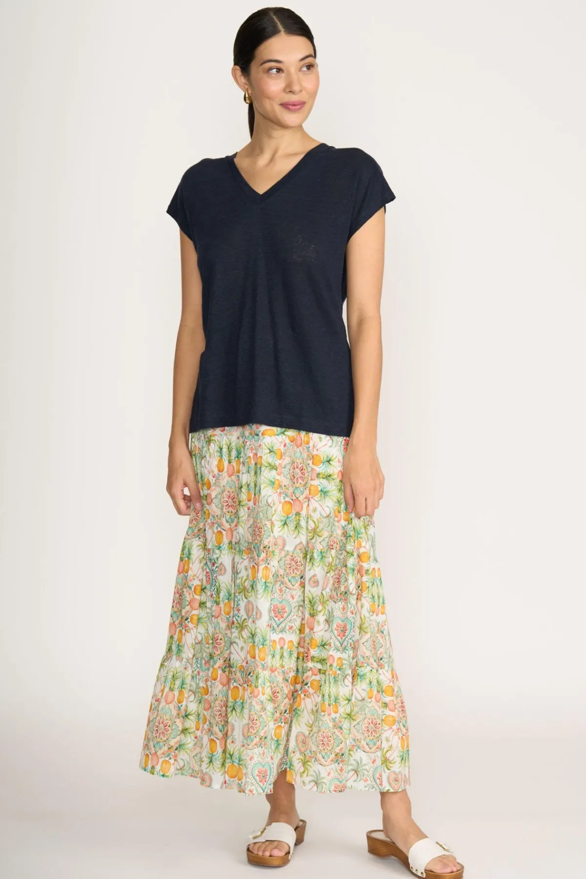 This playful button-up tee features a flattering cap sleeve and a chic v-neckline. Crafted from premium 100% linen jersey, it offers breathable comfort with a soft, natural feel. The eye-catching button detail down the back seam adds a fun twist, making it perfect for stylish days out or casual weekends.