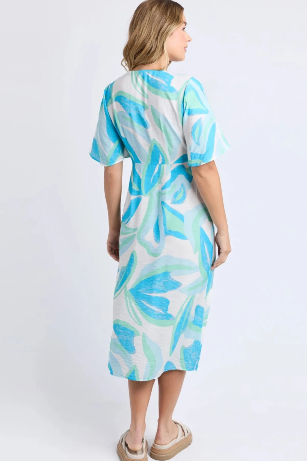 A fresh summer essential, the Ives Midi Dress features a flattering V-neckline, flutter sleeves and a breezy tropical print. Lightweight and effortless, it’s perfect for warm days and easy everyday wear.