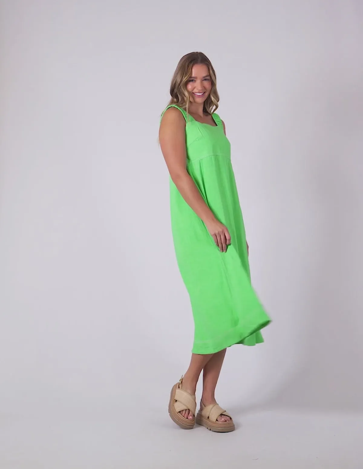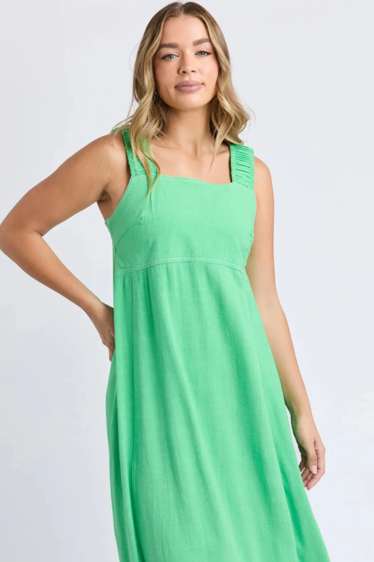 A cool and classic wardrobe staple perfect for both casual and polished looks. Crafted from a breathable linen-lyocell blend, this midi dress offers a flattering A-line silhouette that flows effortlessly. The wide elastic straps provide comfort and bra-friendly coverage, while the contrast stitching adds a touch of style. Its deep sapphire hue is timeless, making it easy to transition from day to night with minimal effort.