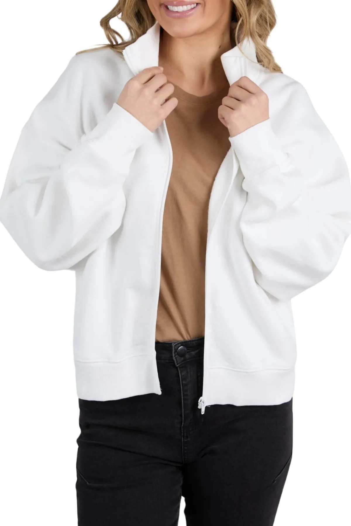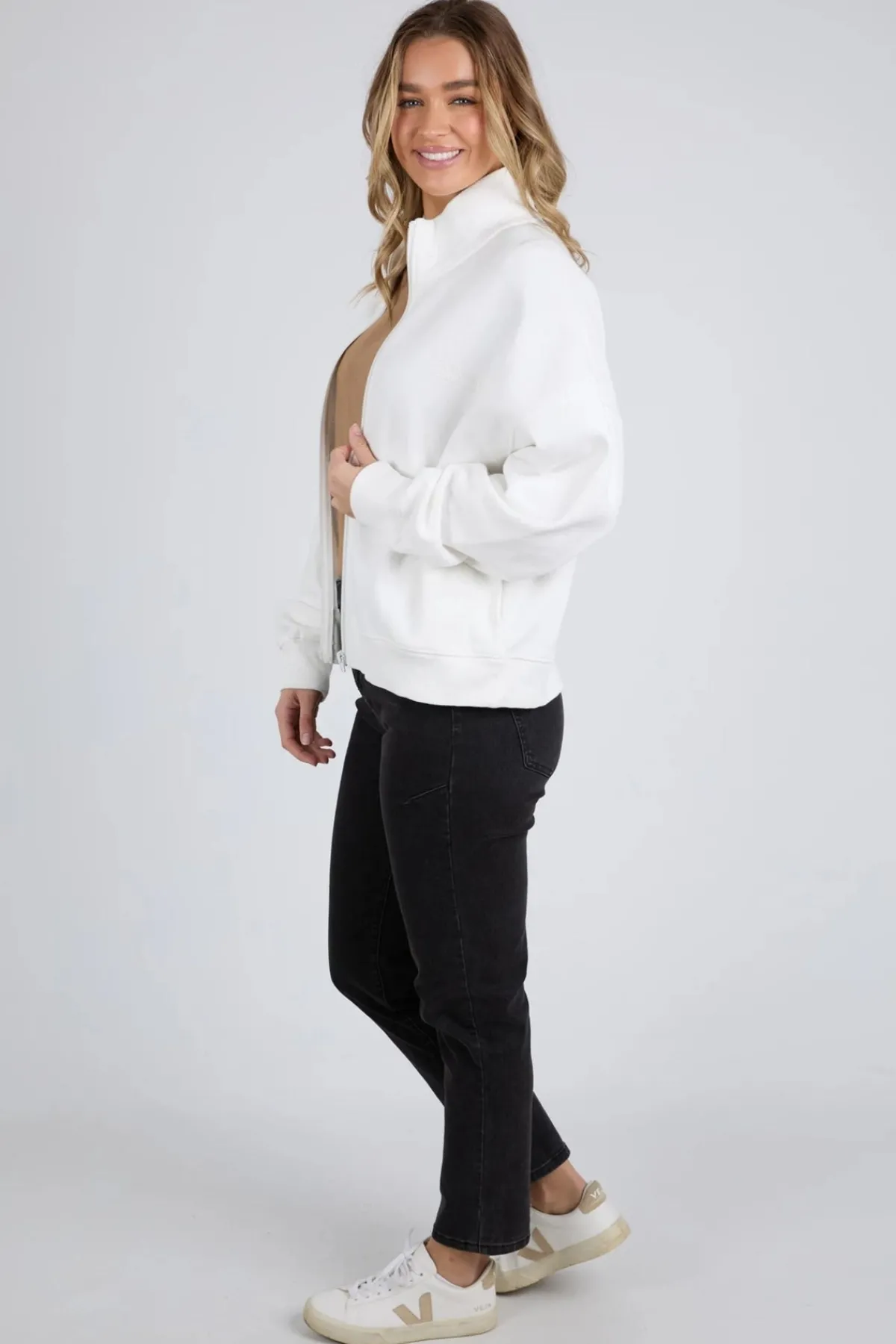- High neckline with front zip