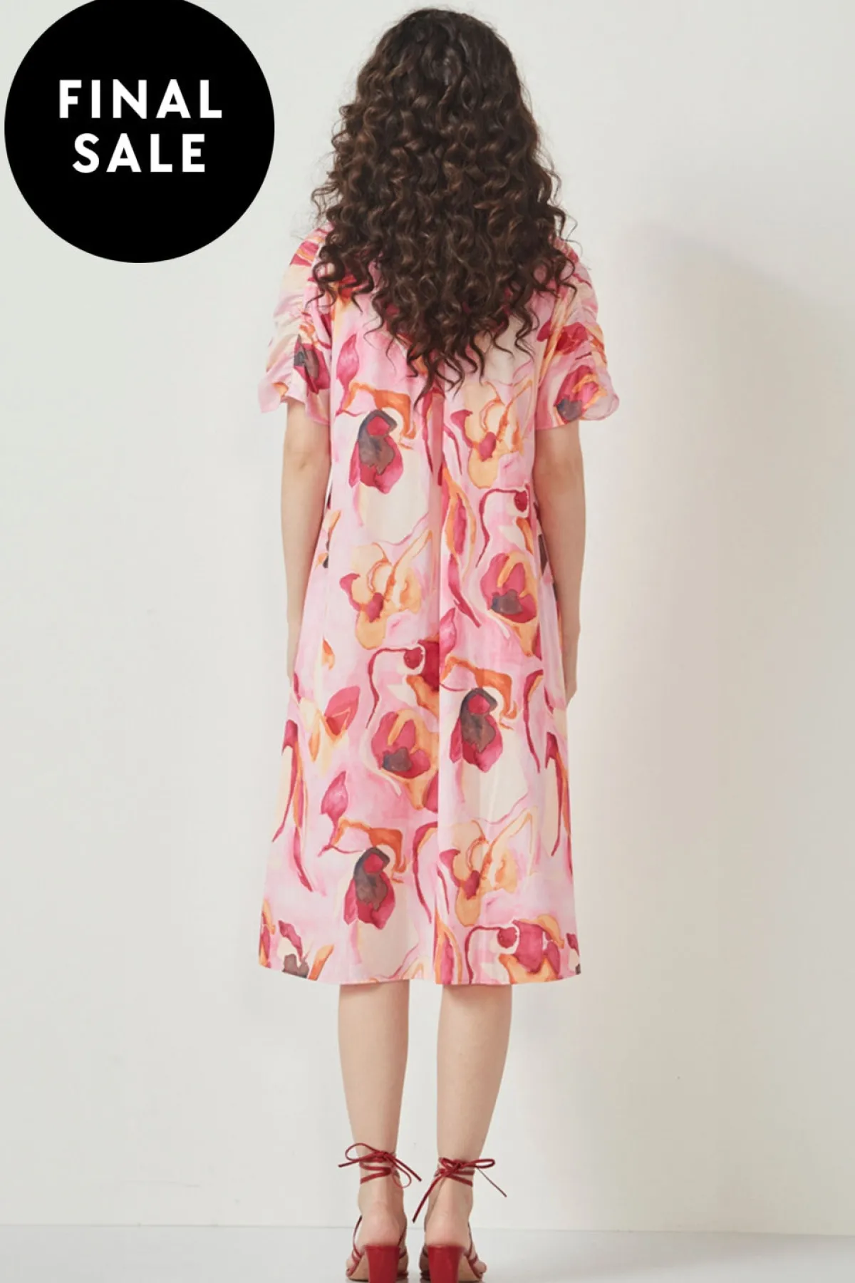 Exclusive Magnolia print dress in soft tumbled satin. The Kahlo dress is a relaxed fit with feature ruched panel sleeve. The Kahlo dress has a V neck line and vertical front seam. Side pockets. The Kahlo dress falls below the knee.