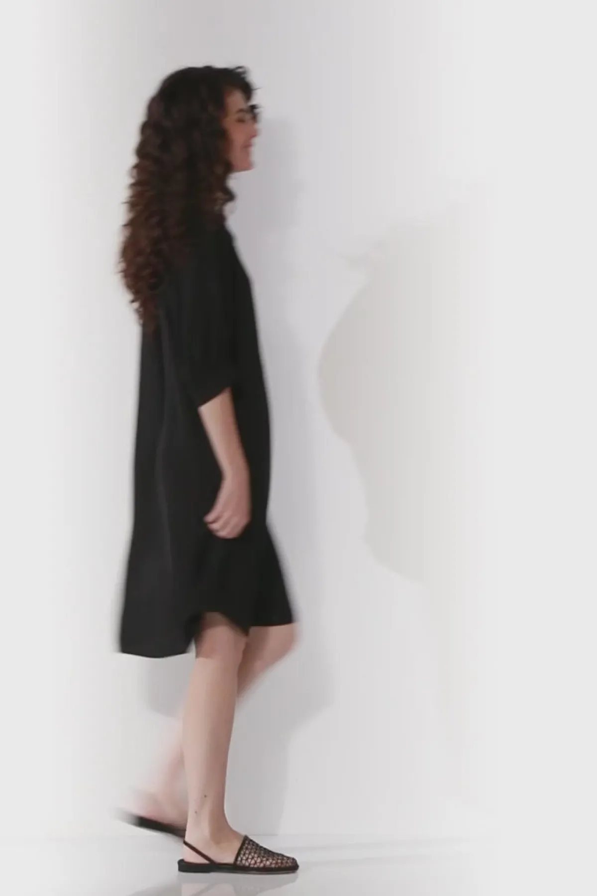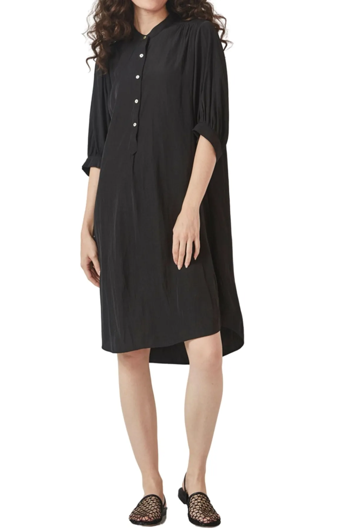 Soft tumbled satin dress with Mandarin collar and button through front placket to the waist. Sleeve falls to the elbow with cuff. The Strike dress falls to mid calf with curved hemline.