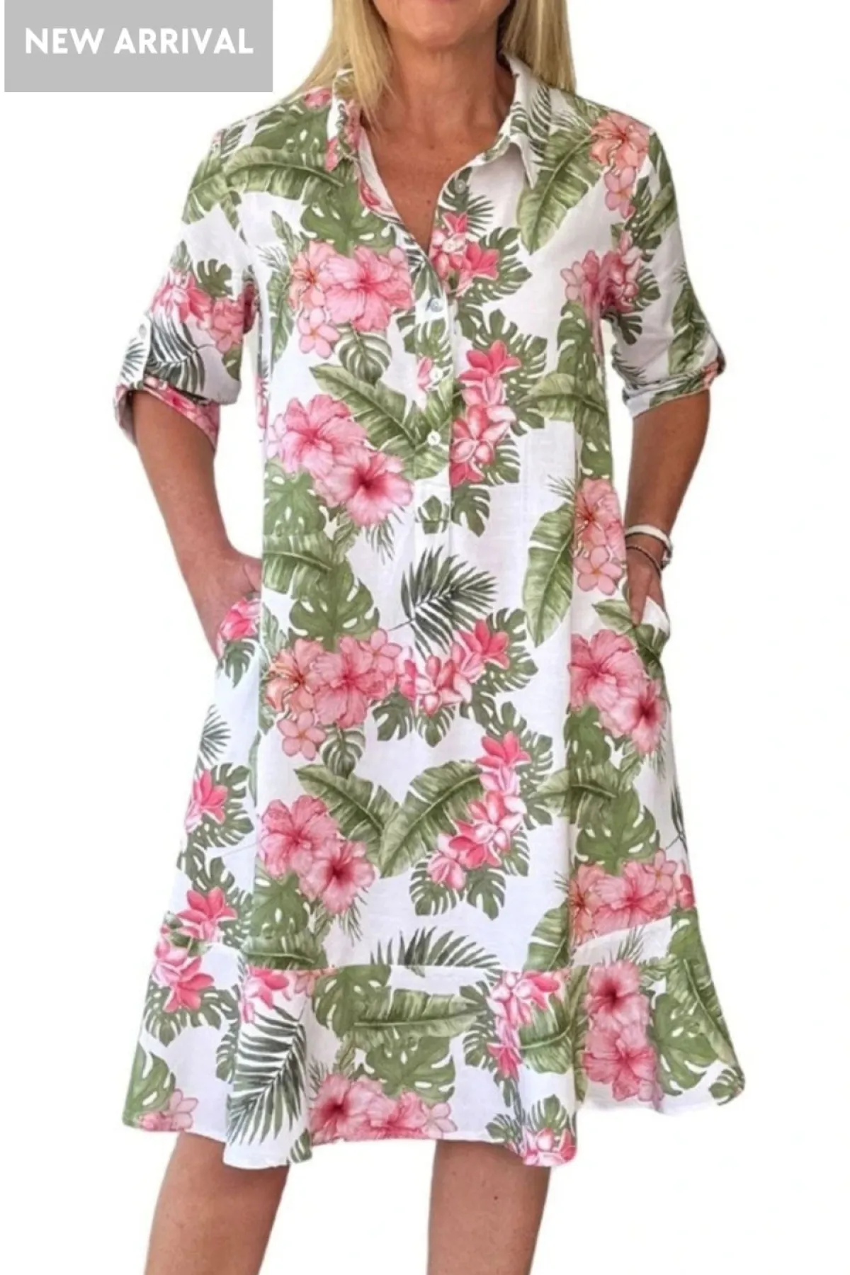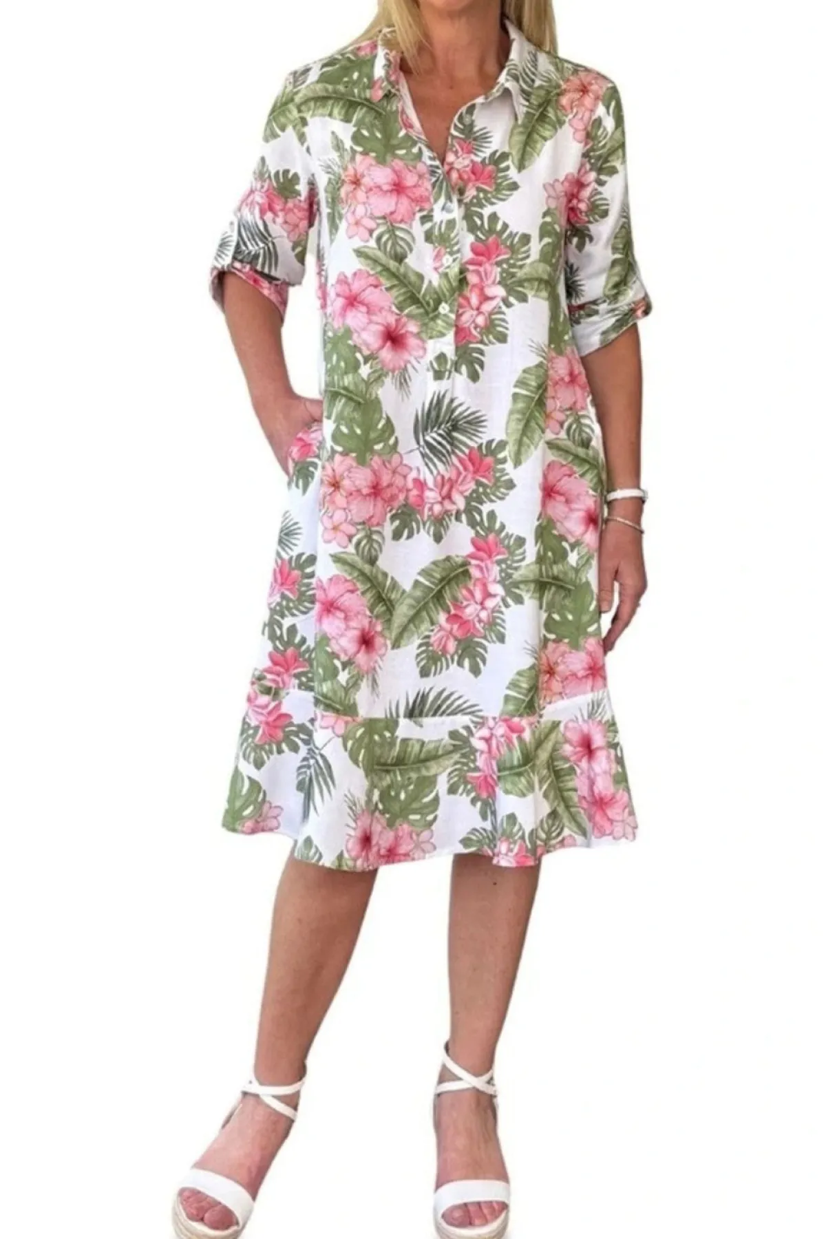 The Caledonia Dress is your go-to for easy, breezy style. Lightweight and comfy, it features a fun tropical print with green leaves and pink blooms on crisp white. With a relaxed fit, button-front, and playful button-tab sleeves, it moves with you for sunny days out or casual hangs. Stay cool and cute with this effortlessly charming dress!