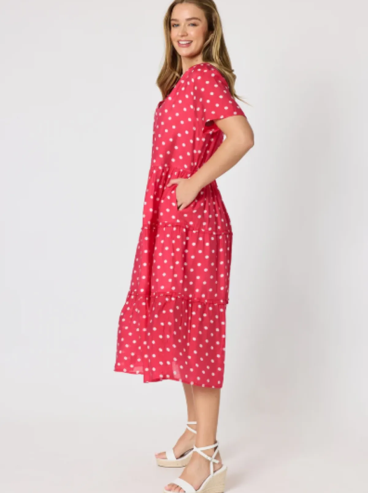 Designed with short sleeves and a partial button-through bodice, this playful spot dress combines relaxed charm with everyday ease. A lightweight cotton lining through the body provides breathable coverage, while the tiered calf-length skirt adds movement and style.