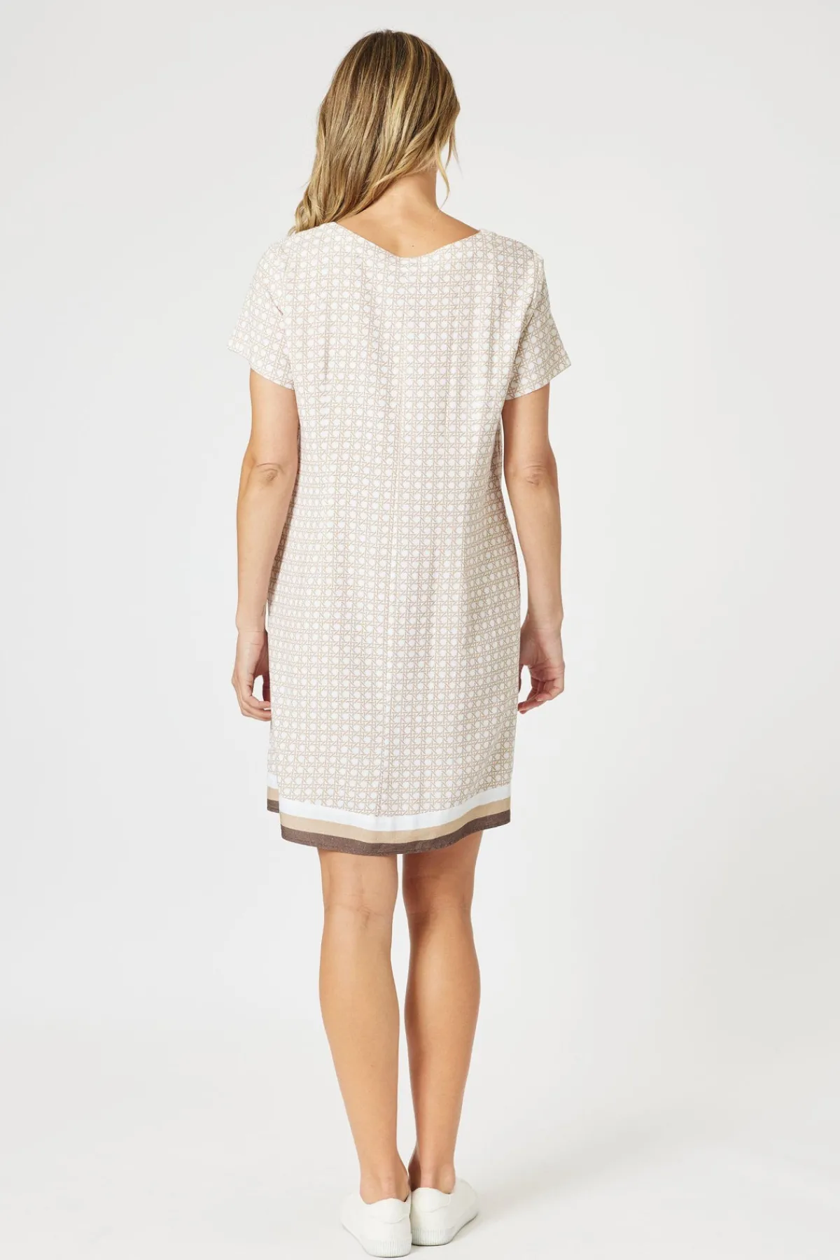 The Rattan Dress by Gordon Smith is a statement in effortless style. Crafted from a breathable viscose linen blend with a soft washer finish, it showcases a stunning all-over rattan-inspired print, finished with a contrasting solid stripe border along the hem for a chic touch. Cut in an easy shift silhouette, this dress is designed with a rounded neckline and short sleeves for everyday wearability, while side pockets add that must-have practicality. Light, versatile, and flattering, its the perfect piece to take you from brunch to beach walks and beyond. Fashion that fits the way you live.