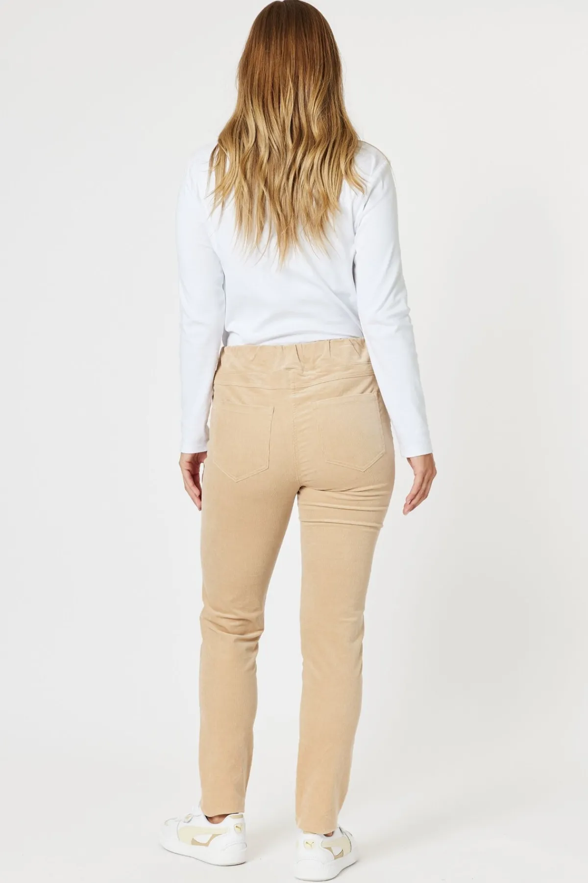 Maximize your style and comfort with the Harper Slim Leg Cord Pant. These high rise pants are designed with a slim leg and pull on design for a flattering fit. Featuring faux front pockets, these pants offer the look of traditional pockets without the added bulk.