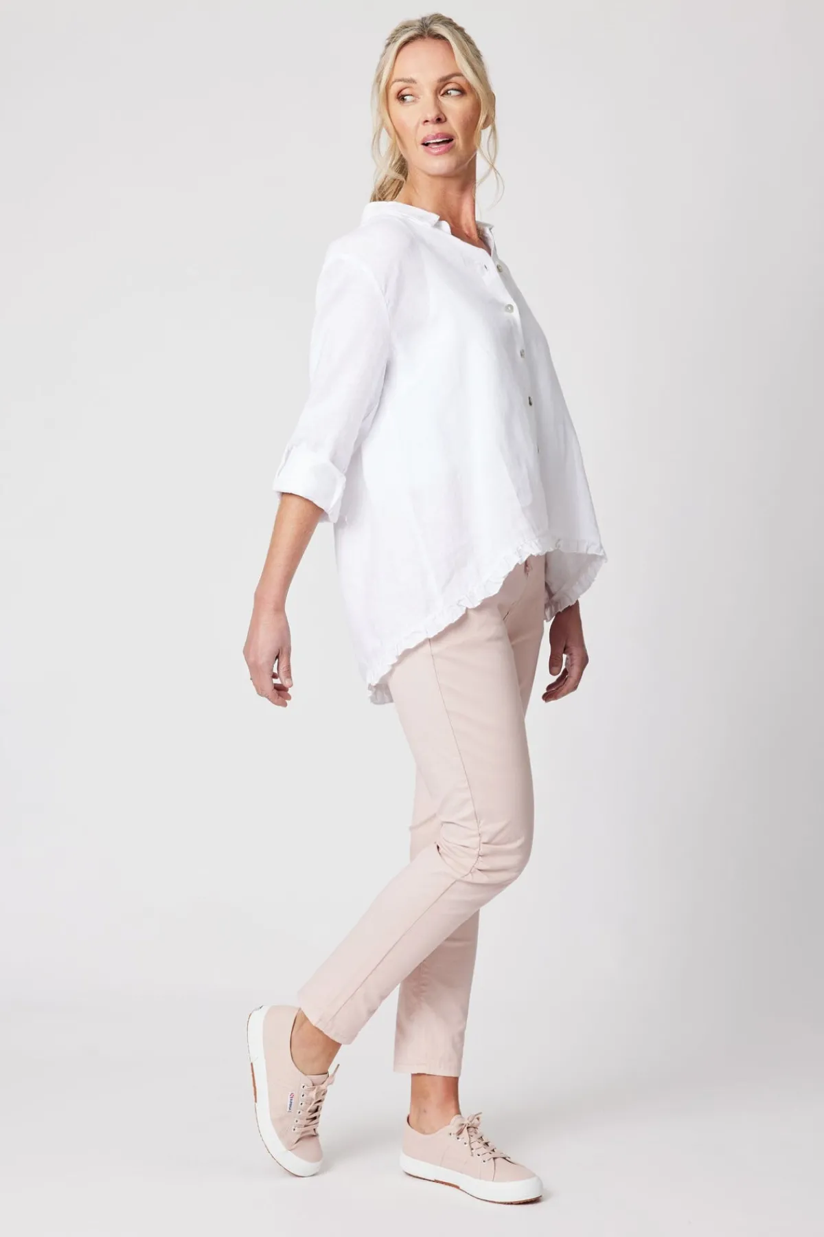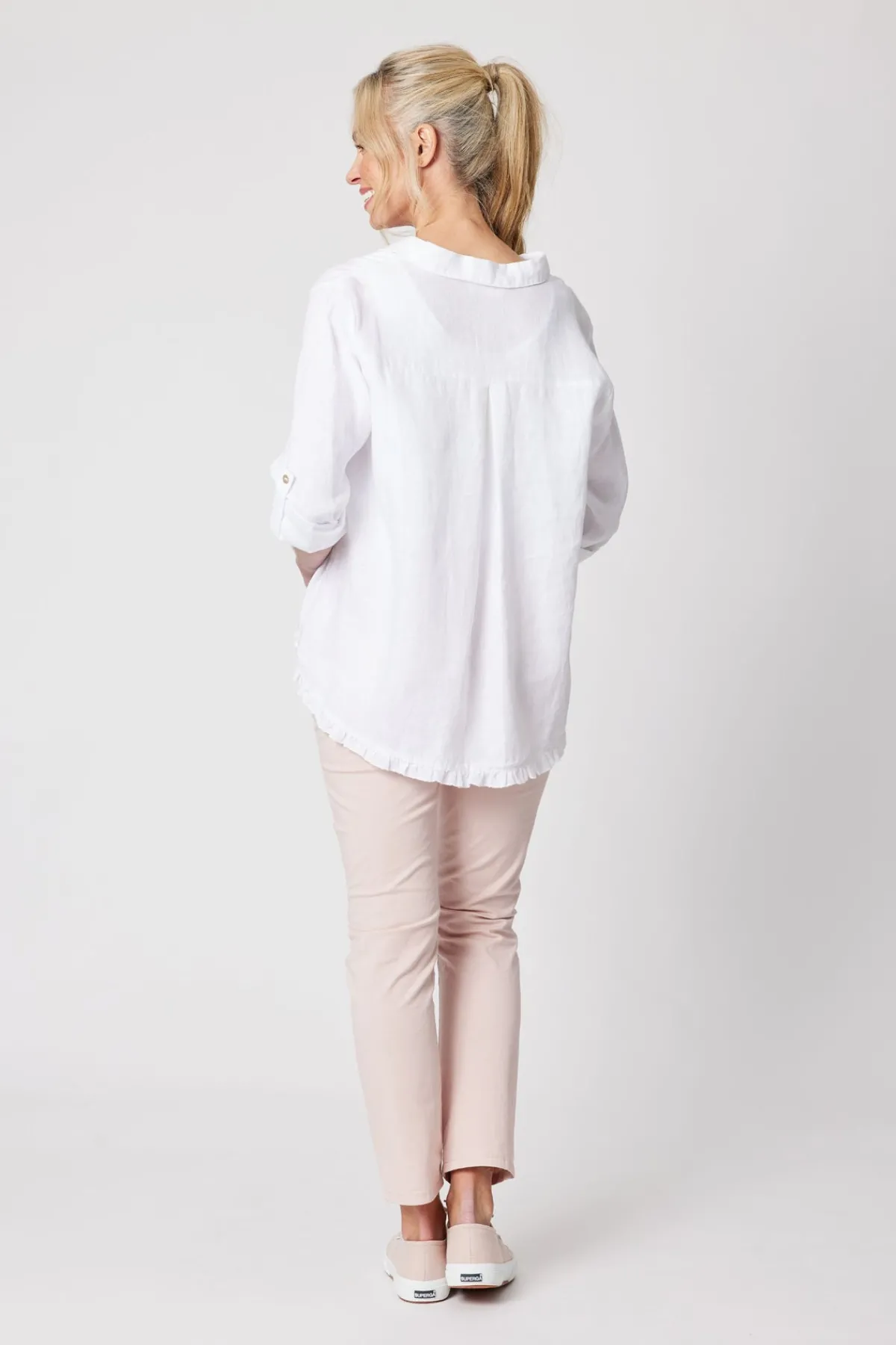 Update your linen shirt with the new Ruffle hem shirt. The perfect length to wear untucked, with a flattering high low hem it pairs back with the jersey waist pant, or style back with a slim leg jean for everyday style.