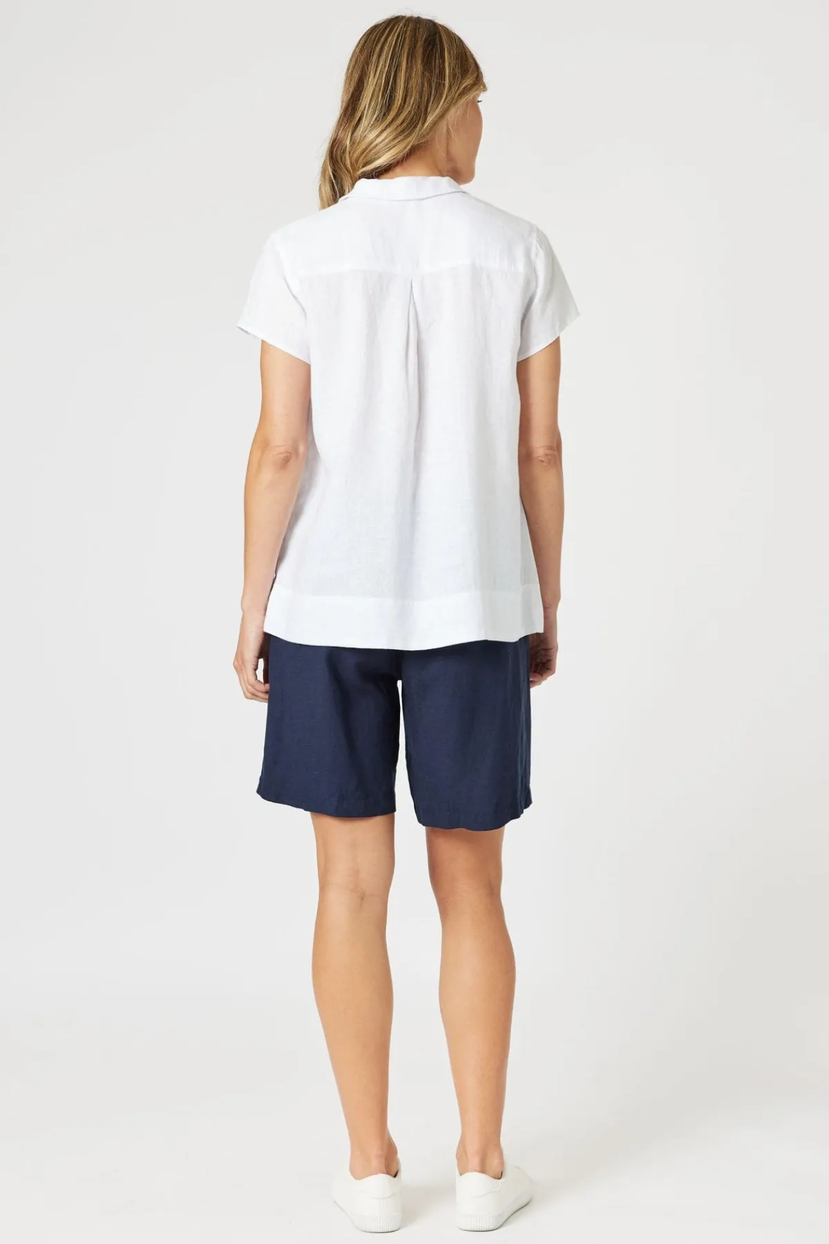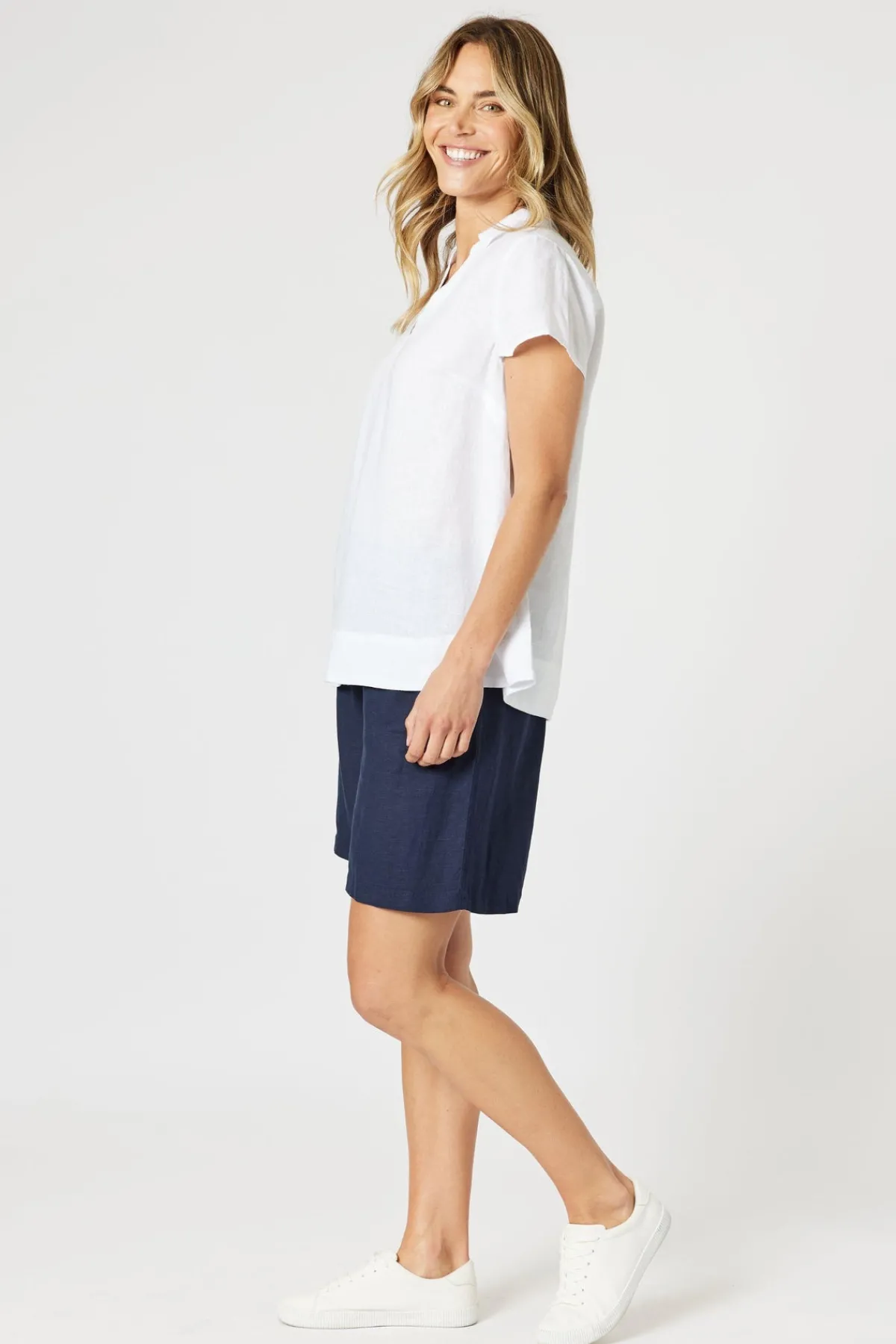 The Lino Short is a versatile and comfortable wardrobe staple made from a soft linen blend, perfect for warm-weather wear. Designed with a flattering high-rise fit, it features a flat front waistband for a polished look and an elasticated back for added comfort and easy pull-on functionality. The knee-length cut offers modest coverage while maintaining a relaxed and modern silhouette. Functional side pockets and belt loops add practicality and style, while the soft fabric makes them ideal for all-day comfort. Perfect for travel, these shorts combine ease, comfort, and effortless style.