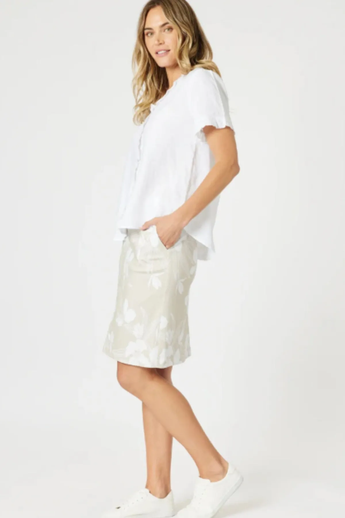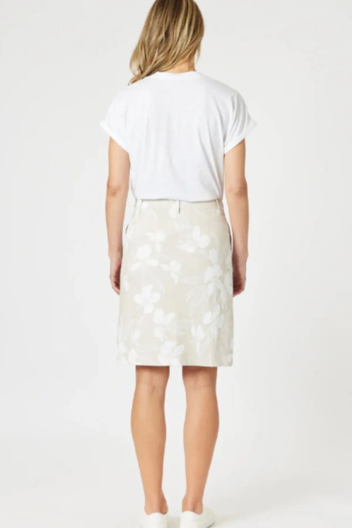 The Morro Bay Skirt combines everyday comfort with effortless style.Crafted from a soft, stretch-cotton blend, this skirt features a subtle natural base with a fresh white floral print, adding a touch of elegance to a classic silhouette.