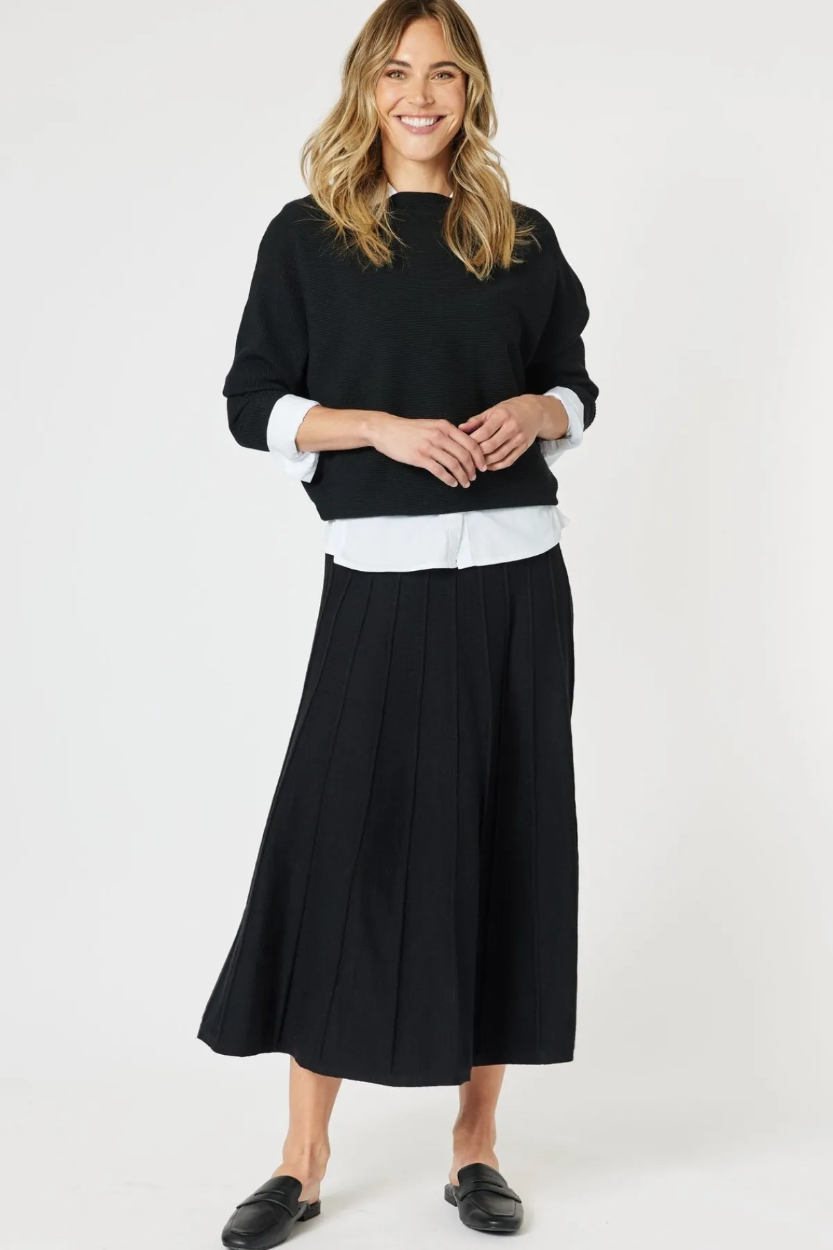 Crafted from a soft knit that contours gracefully, this skirt is designed to offer both comfort and style. It features a flattering elasticated waistband for an easy fit and falls into a gentle A-line shape, making it ideal for a variety of occasions. The subtle texture of the knit adds depth to the classic black, ensuring this piece is far from basic.