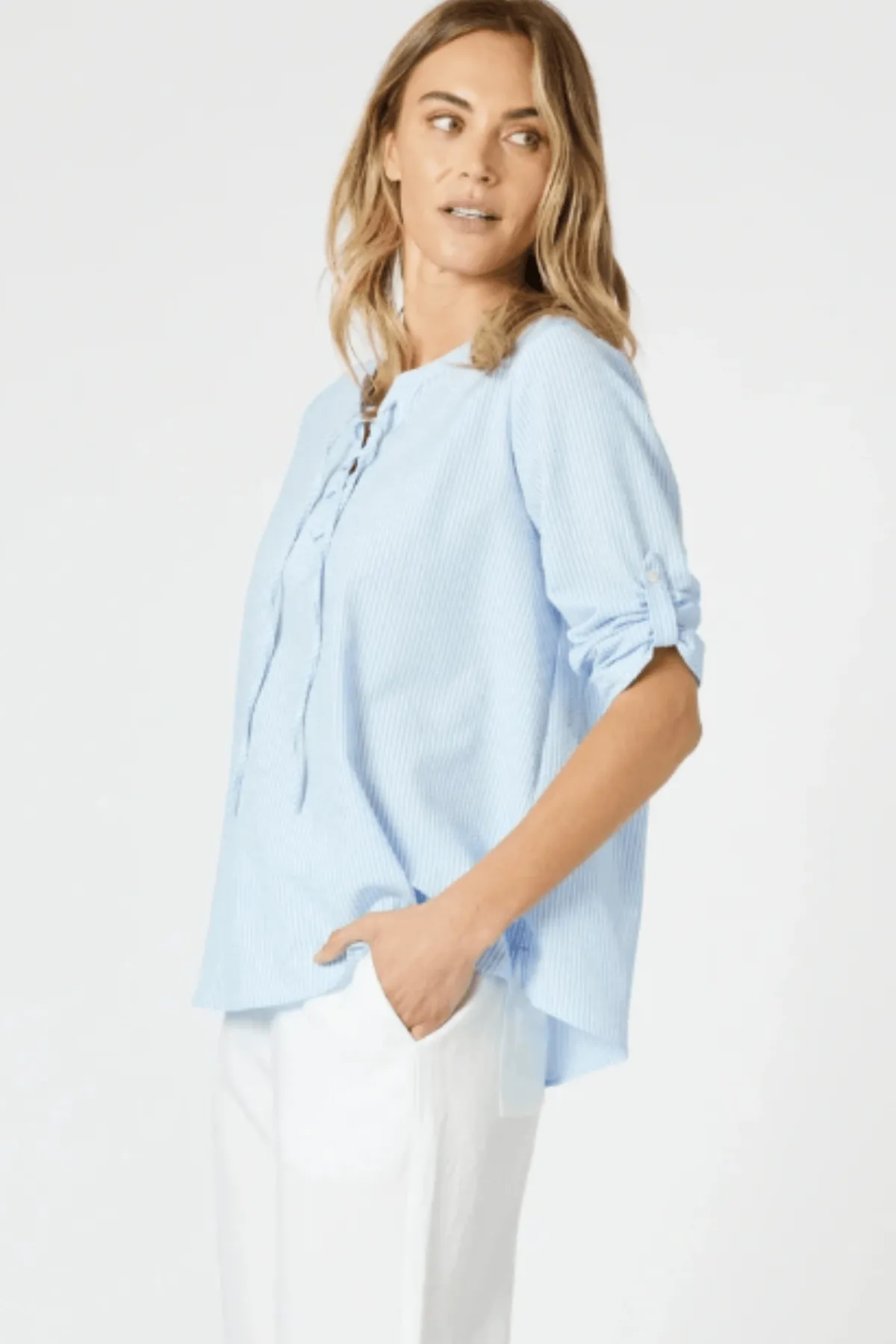 The Marine Stripe Top is a breezy, nautical-inspired piece designed for effortless everyday style.Crafted from a lightweight, crinkle-textured fabric, it features a soft blue and white stripe pattern and a lace-up neckline for a touch of casual charm.Roll-tab sleeves add versatility, allowing you to wear them long or cuffed.This top is perfect for warm days, travel, or laid-back outings – bringing a fresh, coastal vibe to any wardrobe.