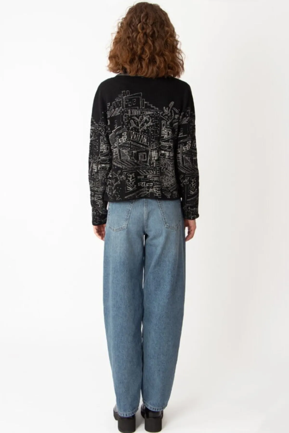 Jacquard jacket with a favela motif, knitted from a blend of wool and viscose. Standard fit with long sleeves, collar, and front button fastening.