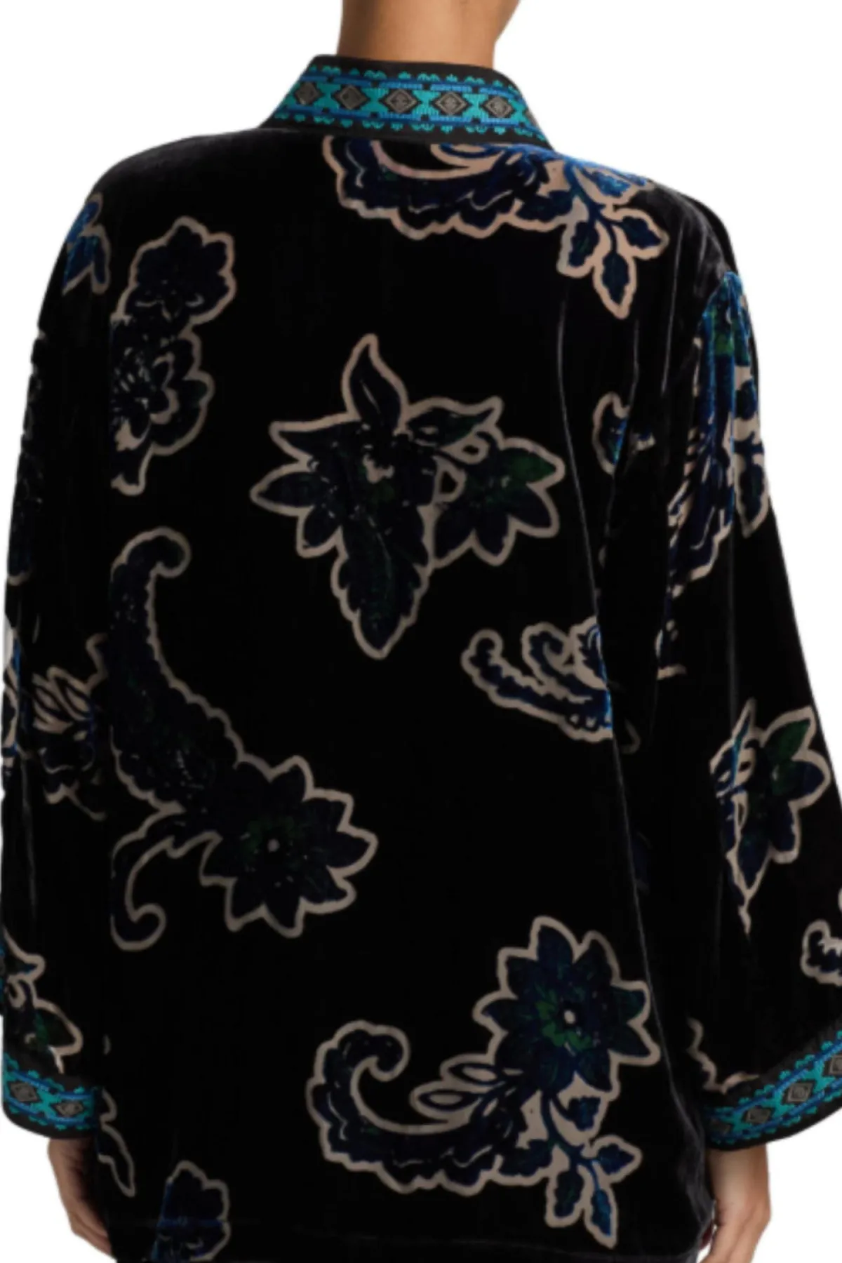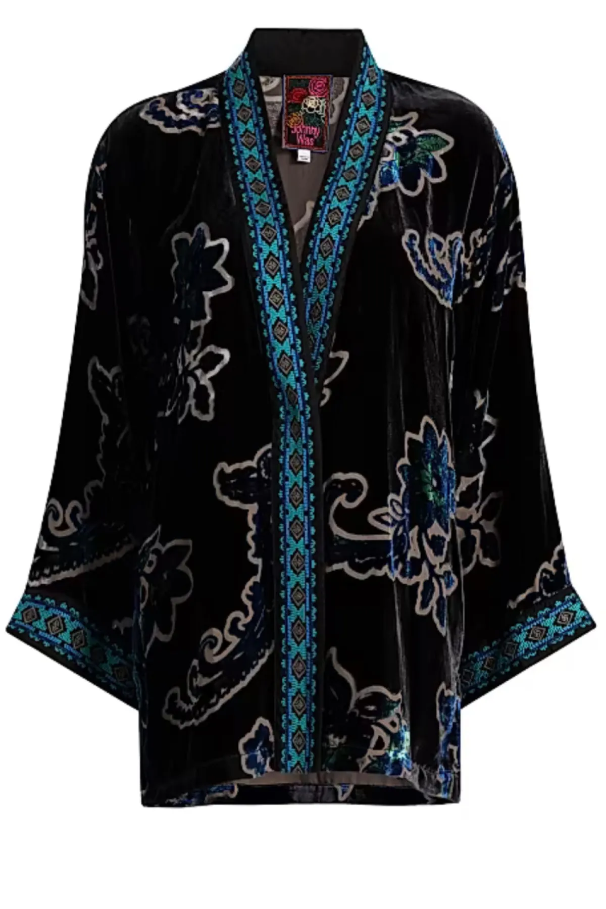 Rich, expressive, and effortlessly dramatic, the Merhawi Kimono in Monade Burnout brings signature Johnny Was opulence to any outfit. Crafted from plush burnout velvet with intricate contrast trim, this relaxed kimono-style jacket flows beautifully and layers seamlessly over both denim and evening looks.
