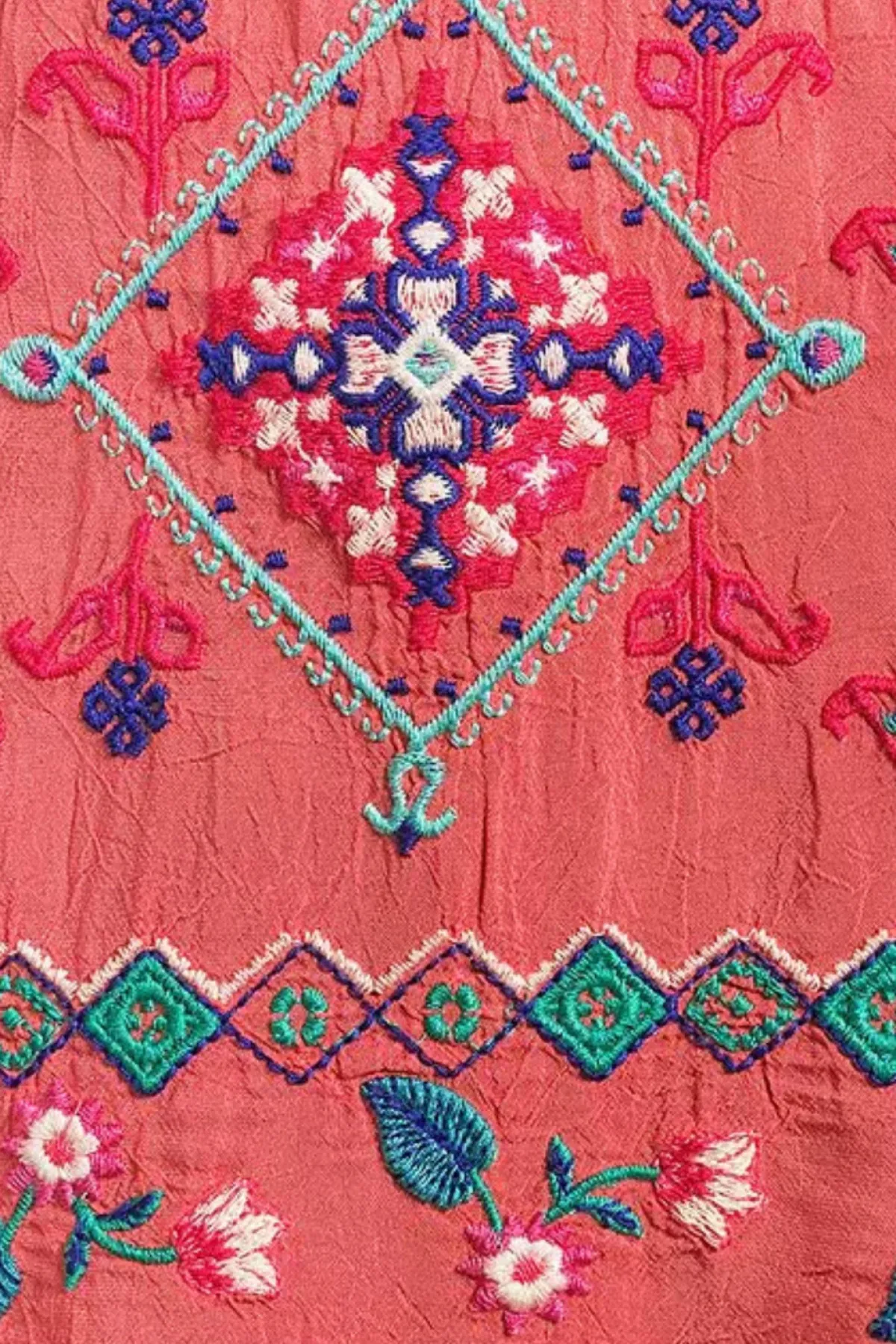 Crafted from a lightweight, flowing fabric, the Brixley Tunic is adorned with vibrant embroidered detailing at the front and sleeves. Featuring a rounded neckline and drop 3/4 sleeves, this vibrant blouse is finished with side slits for a relaxed fit. Pair with a tiered linen skirt and coordinating sandals for a resort-ready combination.