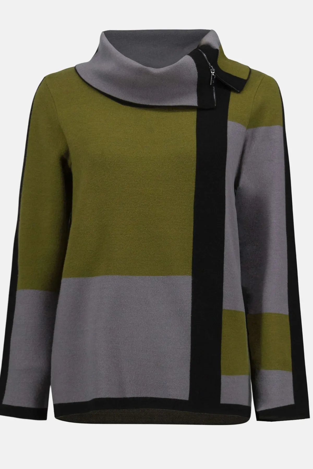 With its sophisticated cowl neck and chic colour-block design, this jacquard sweater is a smart addition to your cold-weather wardrobe. Long straight sleeves and a straight silhouette provide added comfort, making it both stylish and practical for cooler days.
