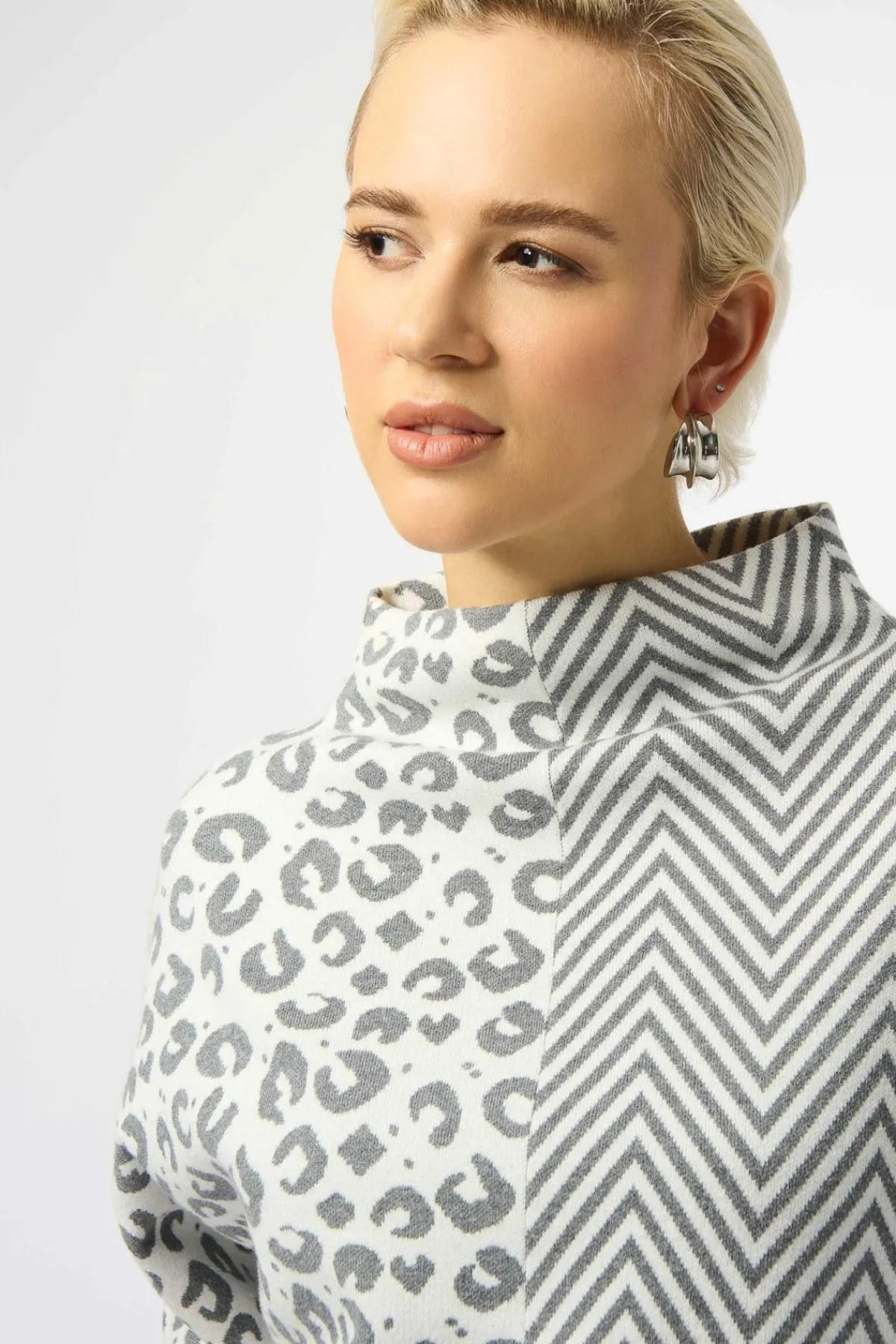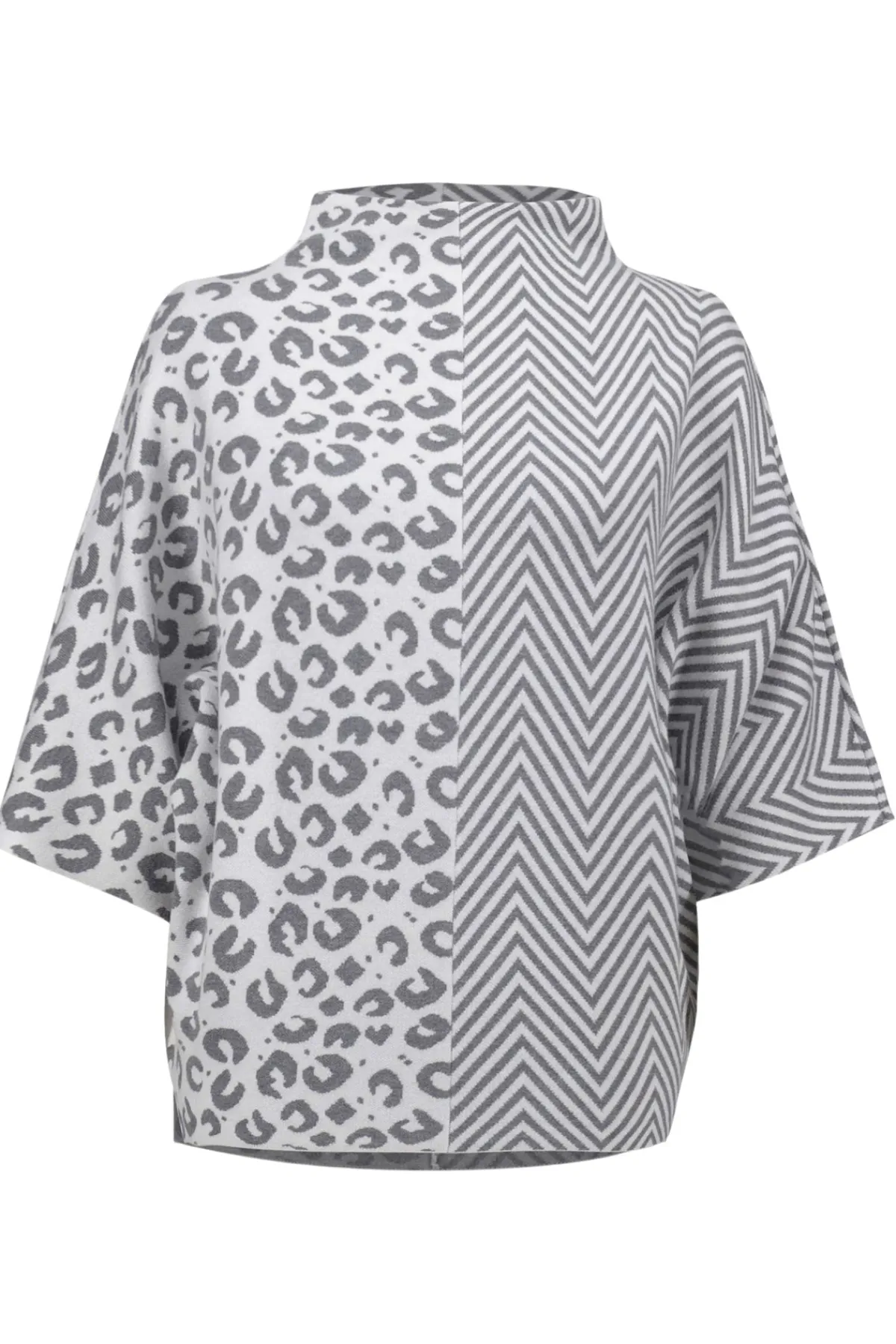 This distinctive top combines bold style with cozy comfort, showcasing a playful mix of patterns—half animal print and half herringbone. Crafted from luxurious jacquard sweater knit, it features a funnel neck, a relaxed boxy silhouette, and roomy three-quarter dolman sleeves for an effortlessly chic look.