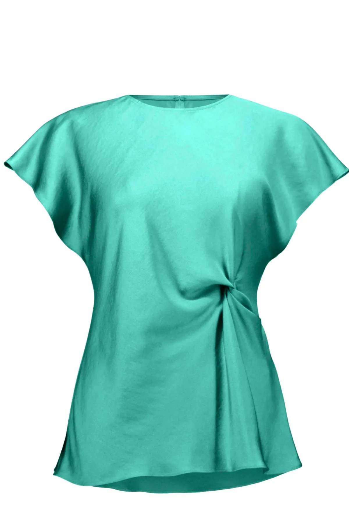 Subtle shine meets sculpted shape in this recycled satin top, designed with a soft twist at the waist, dolman sleeves, and a scoop neckline that opens to a delicate back keyhole with button.